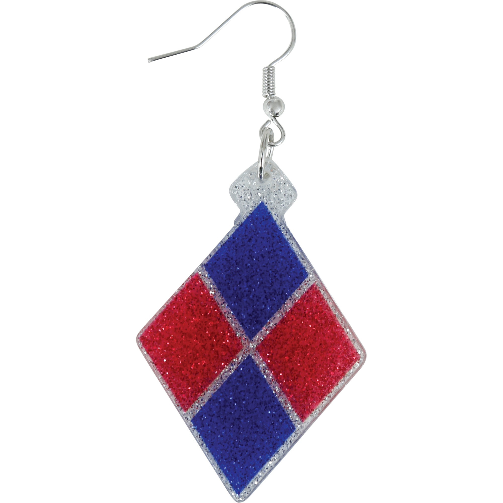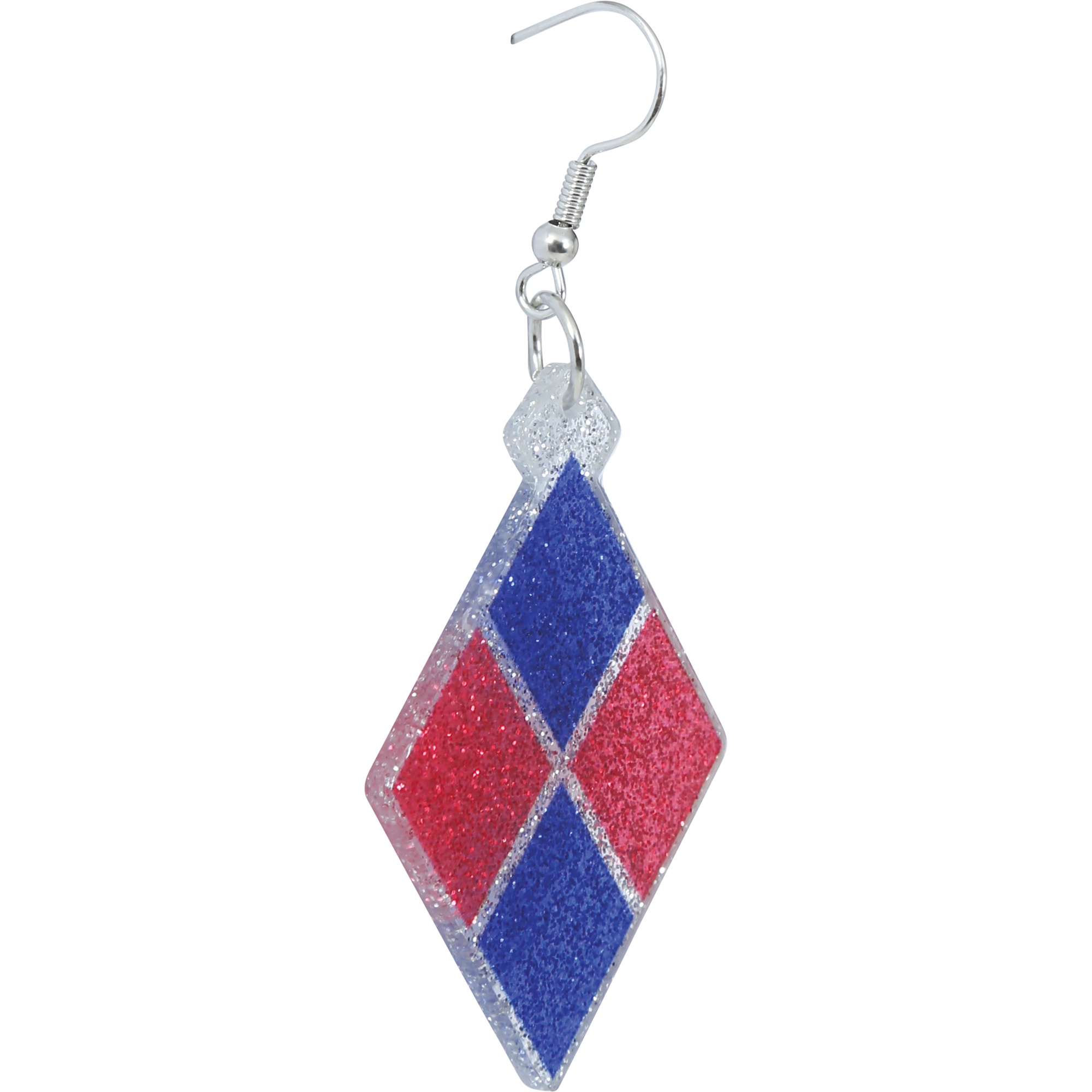Brincos pendentes com padrão de losangos nos clássicos tons vermelho e azul, inspirados no estilo Harley Quinn.