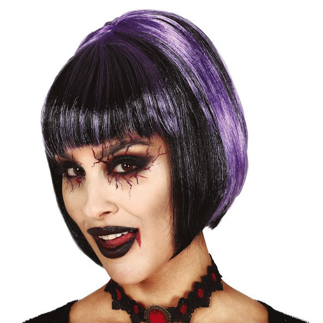 Uma peruca original com cabelo de comprimento médio em morena com madeixas lilás, com a qual pode completar uma infinidade de disfarces temáticos diferentes. É ideal para complementar um disfarce de vampiro.