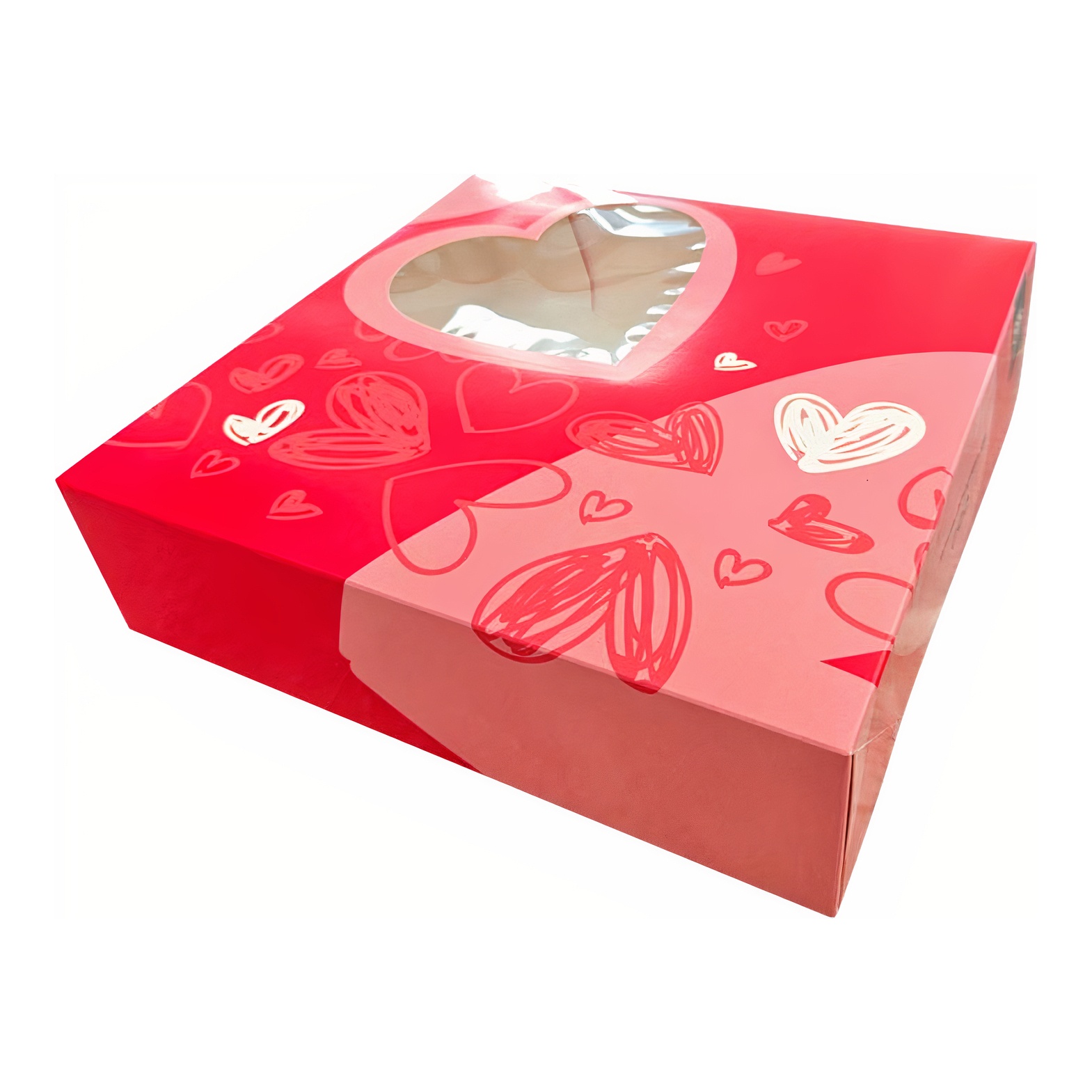 Caixa original de cartão com janela em forma de coração, perfeita para transportar o seu bolo com segurança e estilo no Dia de São Valentim.