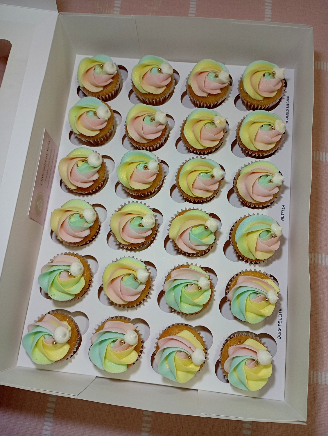 Uma caixa simples que cumpre plenamente a sua função: transportar ou expor 24 mini cupcakes.