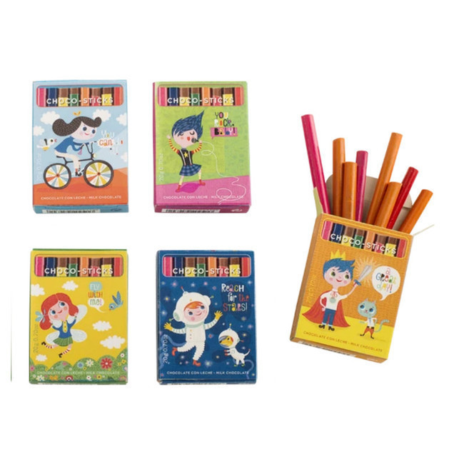 Uma caixinha cheia de deliciosos lápis de chocolate de leite que pode utilizar como presente para as crianças ou para decorar a mesa de doces da sua festa temática.