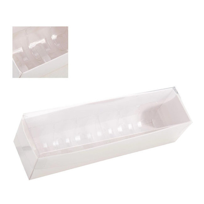 Uma caixa onde pode guardar e transportar os seus macarons, com uma base branca e uma tampa de acetato transparente, que permite ver o interior sem abrir a caixa.