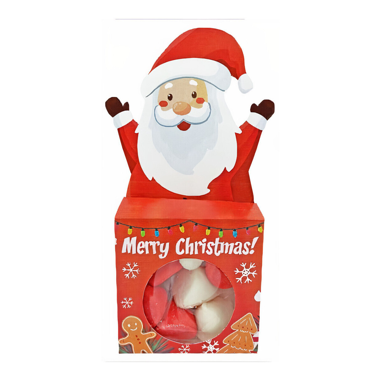 Silhueta de cartão com a imagem de Papai Noel contendo uma saquinho dentro com nuvens vermelhas e brancas, ideal para presentear no Natal.