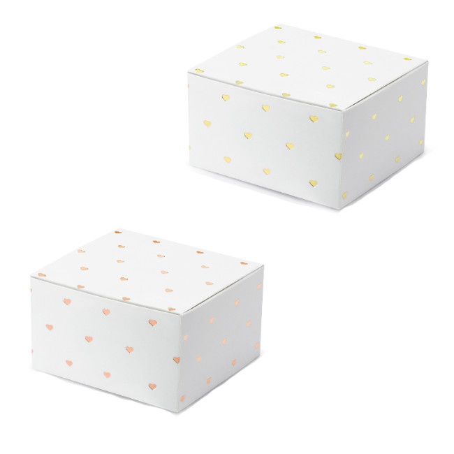 Consiste num pacote com 10 caixas de cartão brancas com pequenos corações. São pequenas, mas ideais para oferecer um pequeno presente a uma pessoa especial ou simplesmente aos convidados do seu casamento ou aniversário.