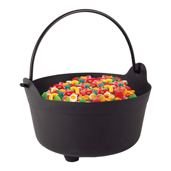 Acessório em forma de caldeirão feito de plástico com uma pega para o transportar confortavelmente.