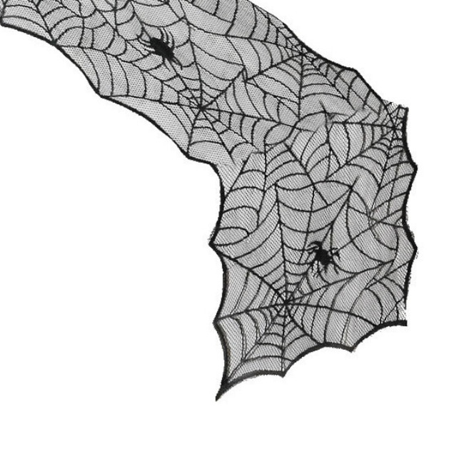 • Caminho de mesa preto de renda com desenhos de teias de aranha.