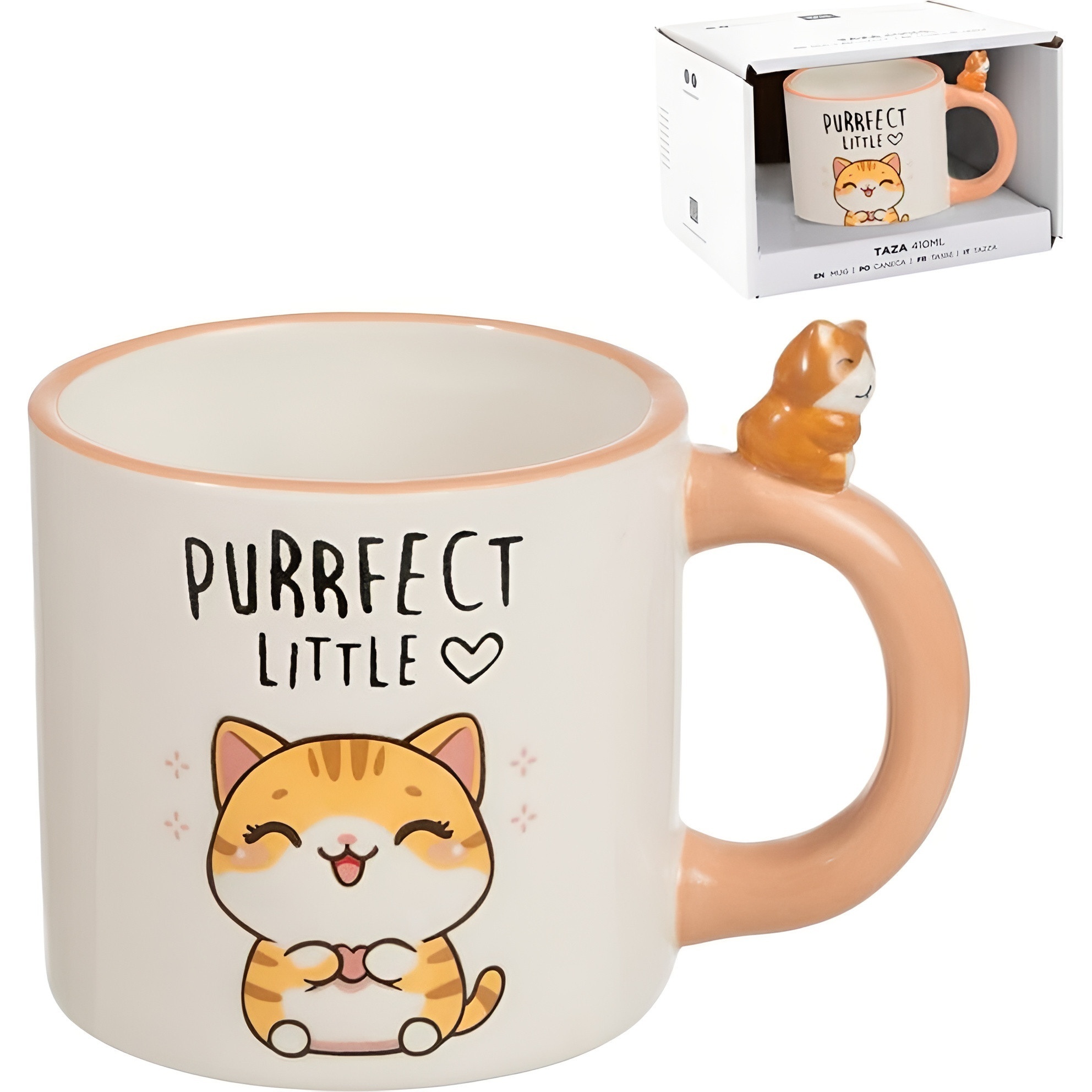 Caneca com design kawaii de gatinho e alça com uma pequena figura decorativa que a torna única e encantadora.