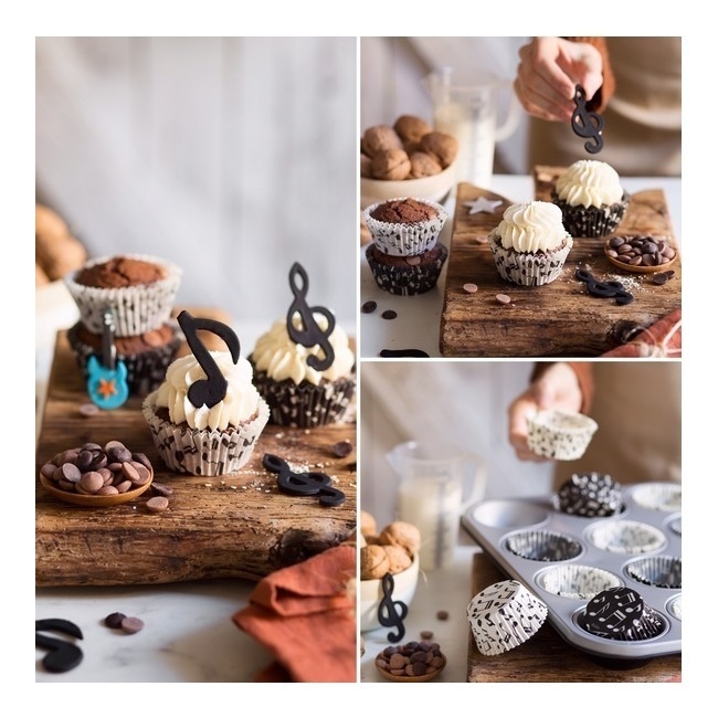 Este fantástico conjunto de cápsulas para cupcakes com um design de notas musicais ajudá-lo-á a conseguir uma apresentação fantástica para os seus doces e sobremesas.
