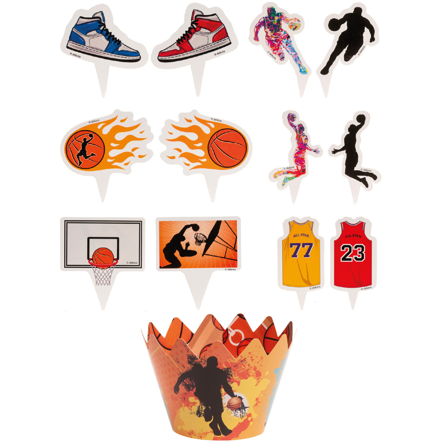 <ul><li>No apto para niños menores de 3 años. Contiene piezas pequeñas desmontables (picks) que pueden provocar asfixia.</li><li>No es un juguete; usar únicamente como decoración de repostería y bajo supervisión de un adulto.</li><li>Las puntas de los picks pueden ser afiladas; manipular con cuidado para evitar pinchazos o lesiones en ojos y manos.</li><li>Material inflamable (cartón/papel): mantener alejado de fuentes de calor, estufas y llama abierta.</li><li>No introducir en horno, microondas ni cerca de superficies calientes; no apto para hornear ni para calentar alimentos dentro de este accesorio.</li><li>No lavar en lavavajillas ni reutilizar si está dañado, humedecido o manchado; desechar tras el uso previsto.</li><li>Efectuar la inserción completa de los picks en el cupcake y comprobar que quedan firmes para reducir riesgo de desprendimiento durante el transporte o consumo.</li><li>Evitar contacto directo prolongado con alimentos muy grasos, aceitosos o extremadamente calientes por posible transferencia de tintas o recubrimientos.</li><li>Almacenar en un lugar seco y protegido de la luz solar directa y la humedad para prevenir deformaciones y crecimiento de moho.</li><li>Desechar conforme a las normas locales de reciclaje para papel/cartón; si el producto tiene revestimiento plástico o tintas no reciclables, depositar en la fracción de residuos correspondiente.</li></ul>