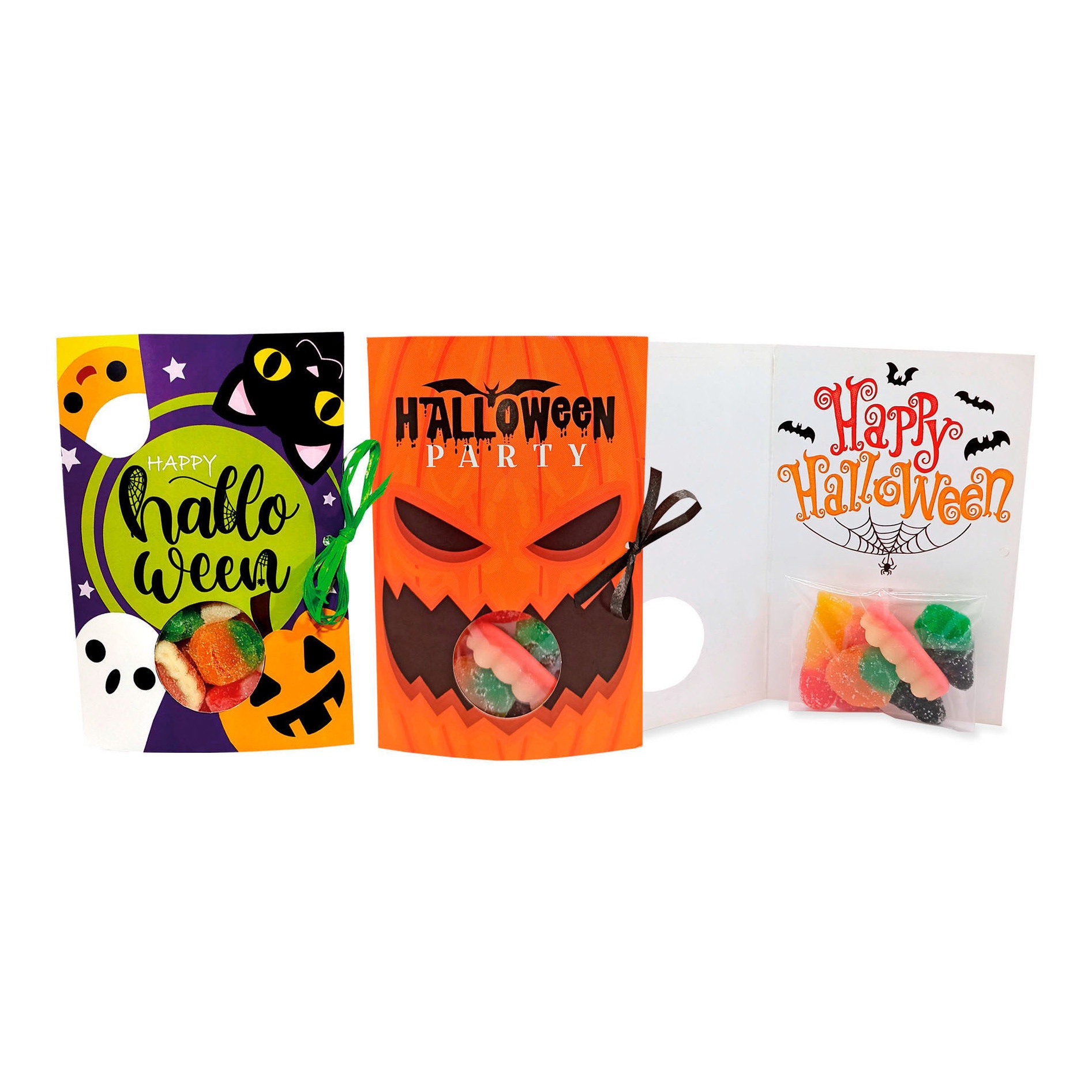 Presenteie os seus convidados com este cartão de Halloween com doces dentro.