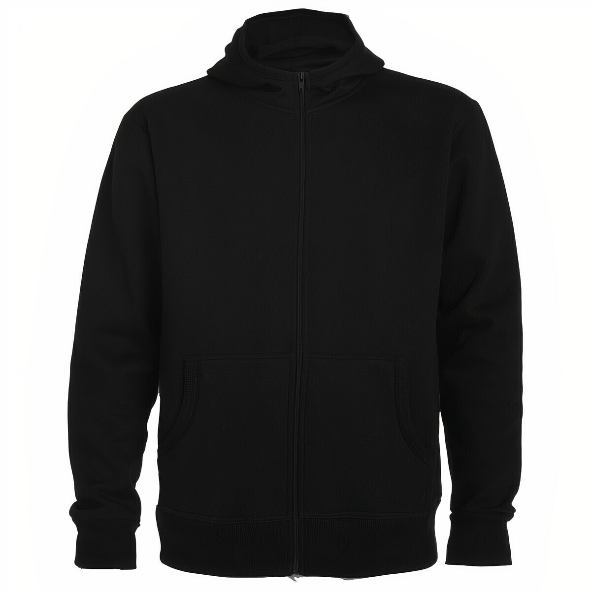 Bolsos canguru; contorno do capuz, punhos e barra em ribana 2x1 com elastano.