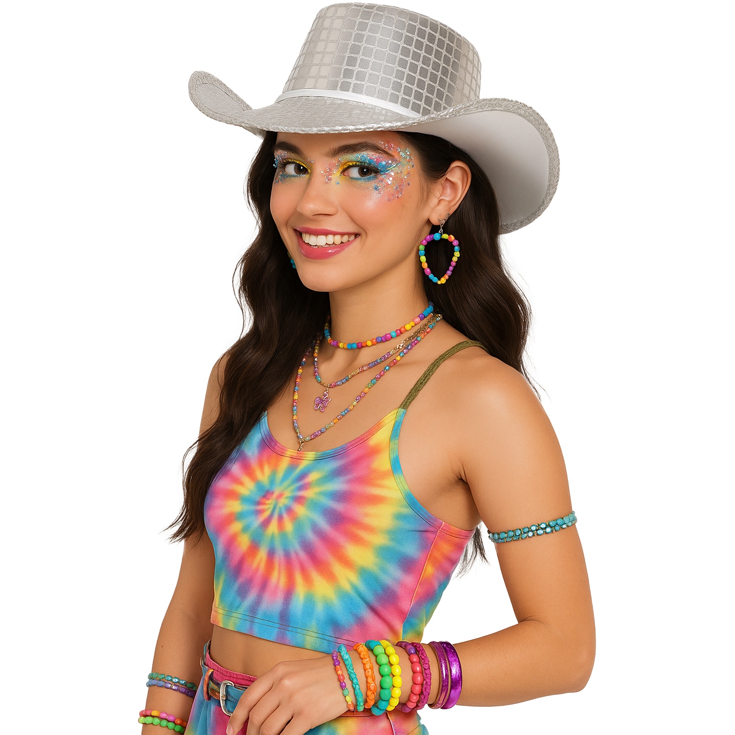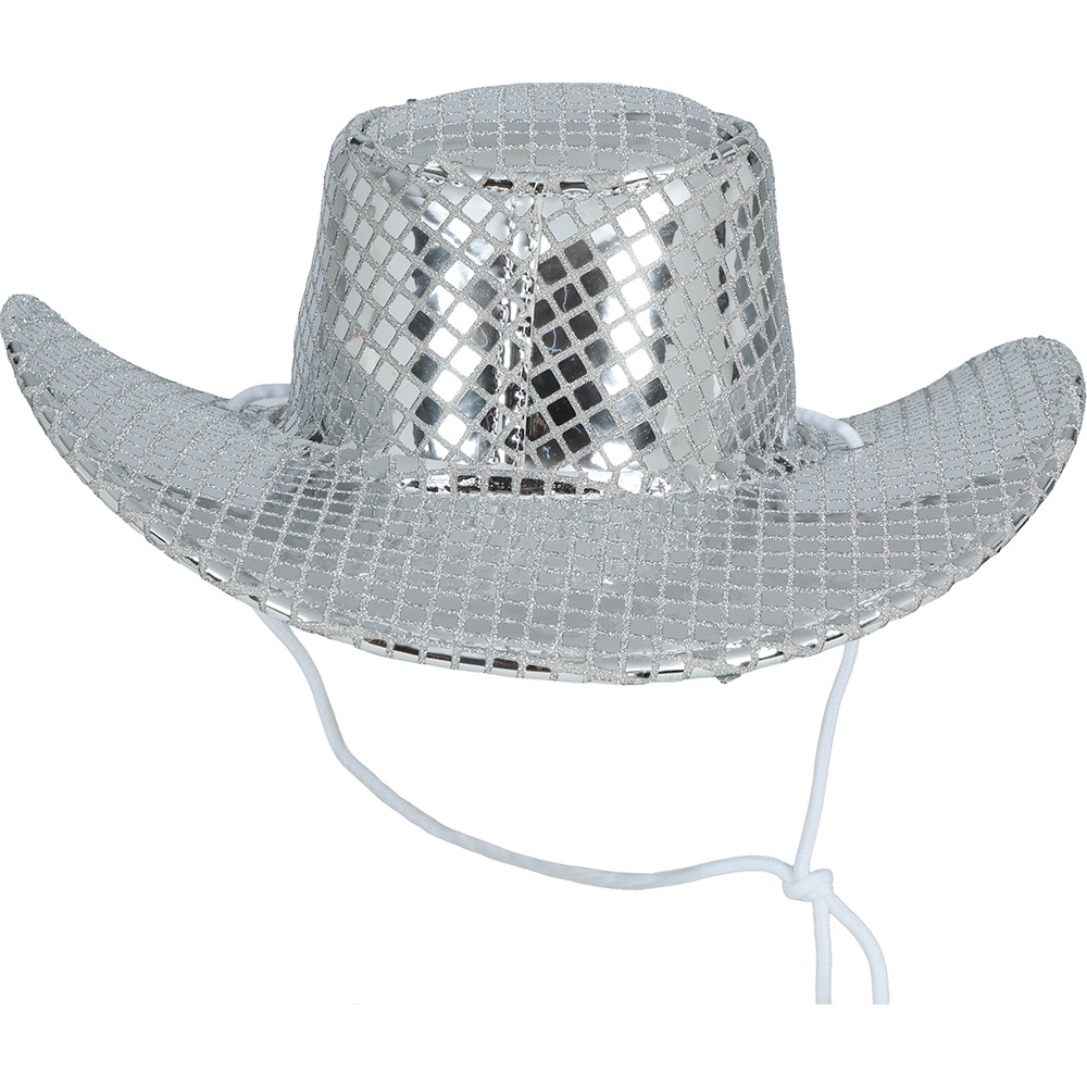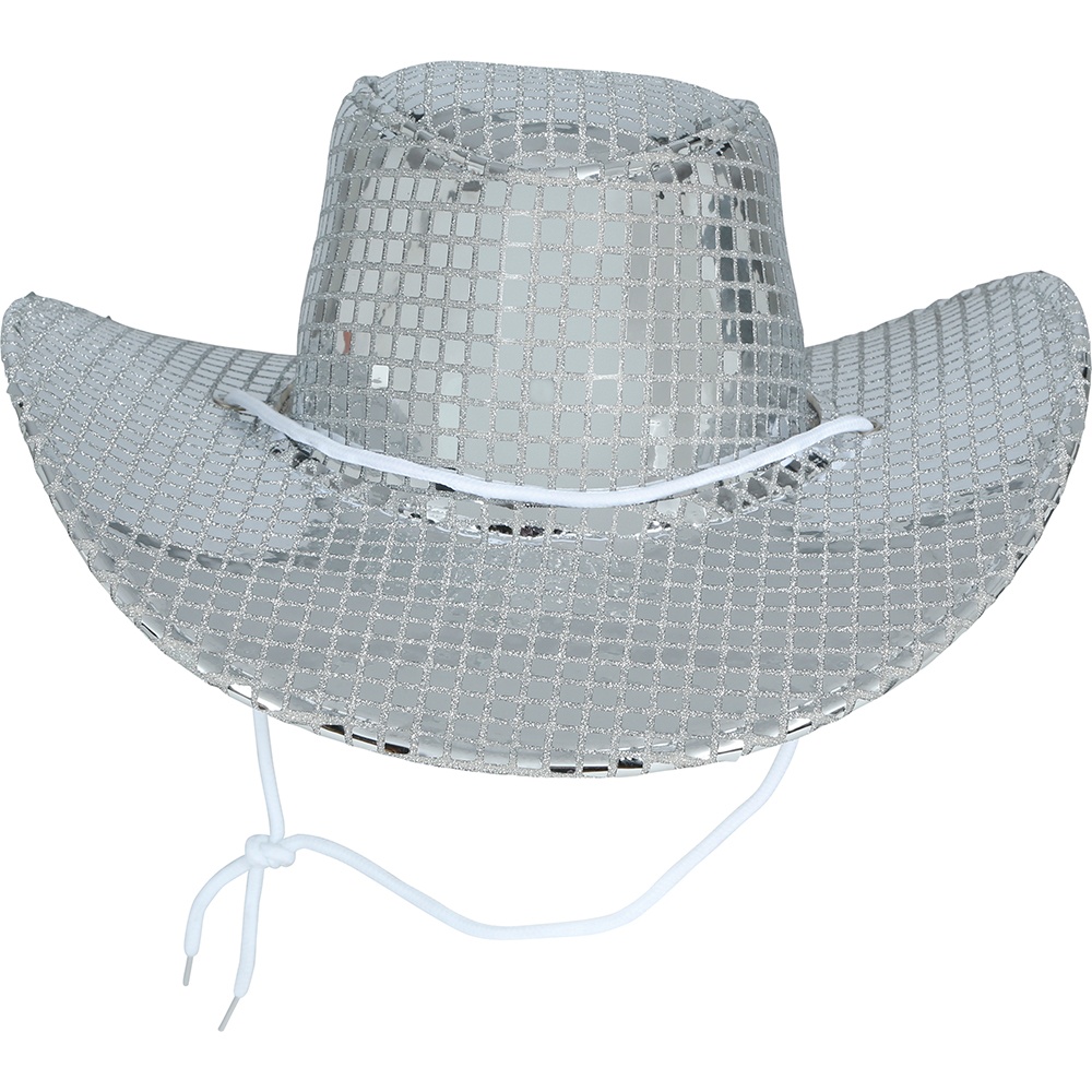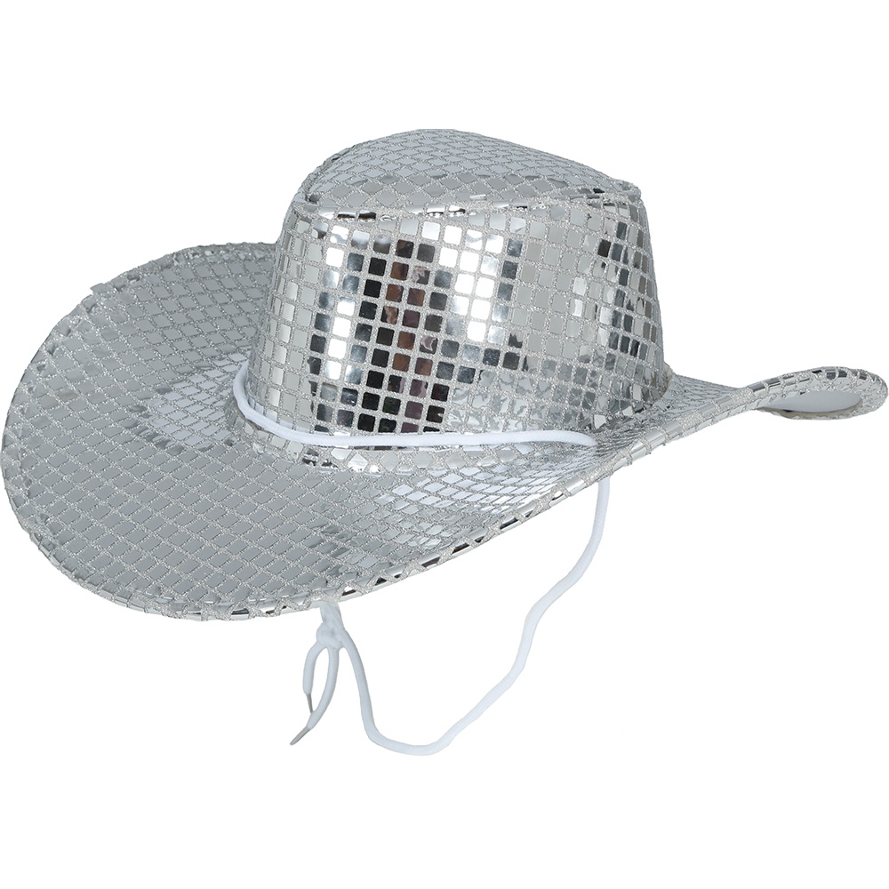 Chapéu de cowboy prateado com acabamento brilhante em estilo disco dos anos 80, concebido para sobressair em festas e carnavais. Combina a silhueta clássica do cowboy com um efeito espelhado atrativo que capta todos os olhares. Leve e confortável, permite que o senhor/a senhora o utilize por longos períodos em eventos e sessões de fotos. O design inclui cordão ajustável para manter o chapéu no lugar durante a festa. Ideal para looks retrô, temáticas disco e combinações com acessórios festivos.
