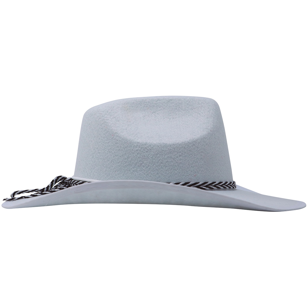 Este chapéu é um clássico do género western. Tem a aba do chapéu virada para cima e um cordão preto e branco à volta da copa.