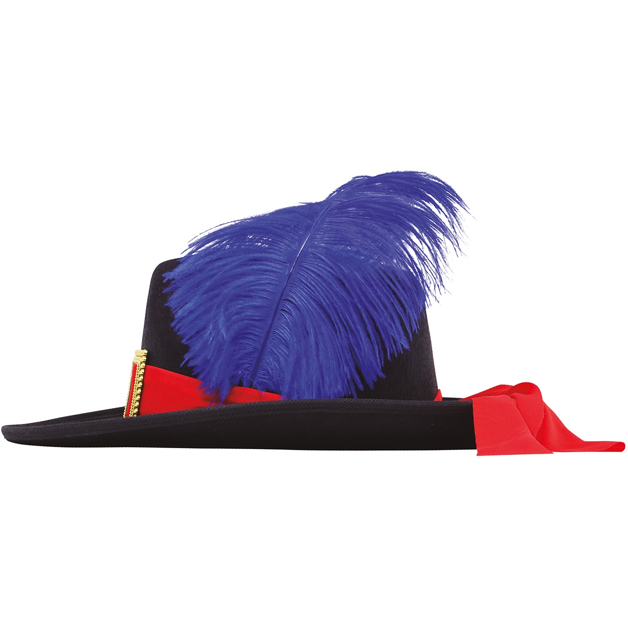 hapéu de feltro preto com uma fita vermelha pendurada na parte de trás, com uma fivela dourada no meio e uma pena azul