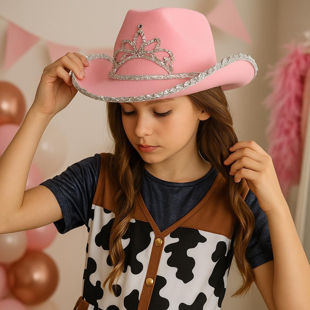 Chapéu de vaqueira infantil com coroa rosa
