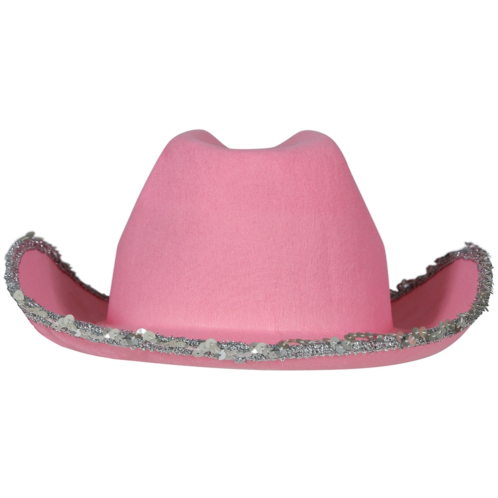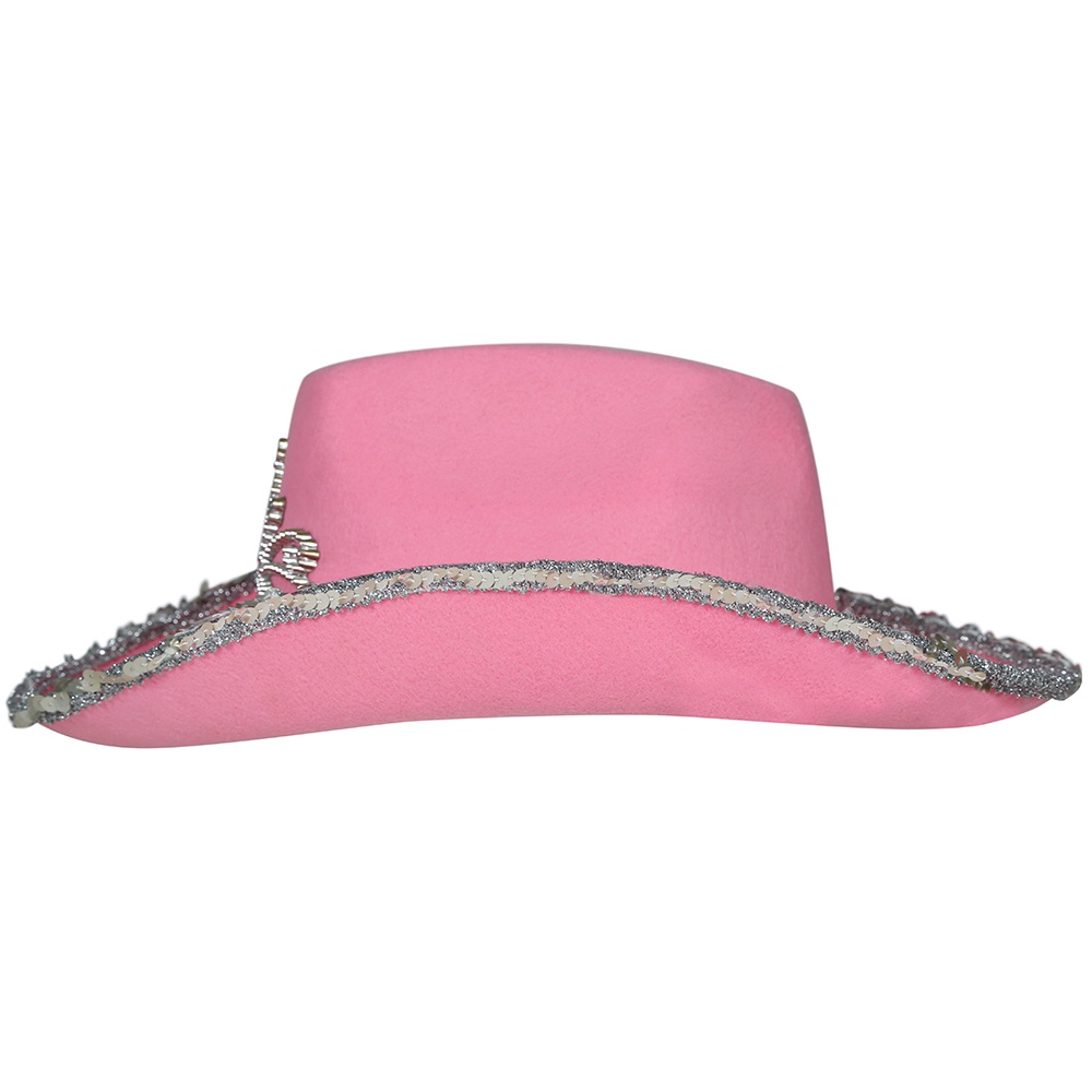 Chapéu de vaqueira rosa pensado para meninas que procuram um toque divertido e brilhante. Apresenta acabamento com lantejoulas prateadas na aba e um motivo em forma de tiara com pedraria na copa, que confere um ar de princesa vaqueira.