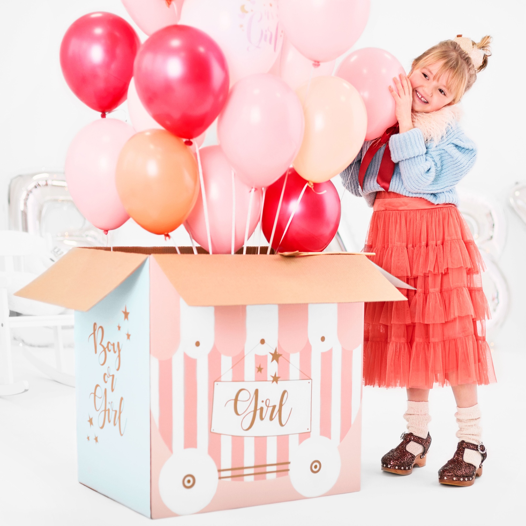 É uma caixa surpresa que revela se vem aí um rapaz ou uma rapariga. Encha-o de balões, confettis e decorações cor-de-rosa ou azuis para uma explosão de cor e de alegria quando for aberto.
