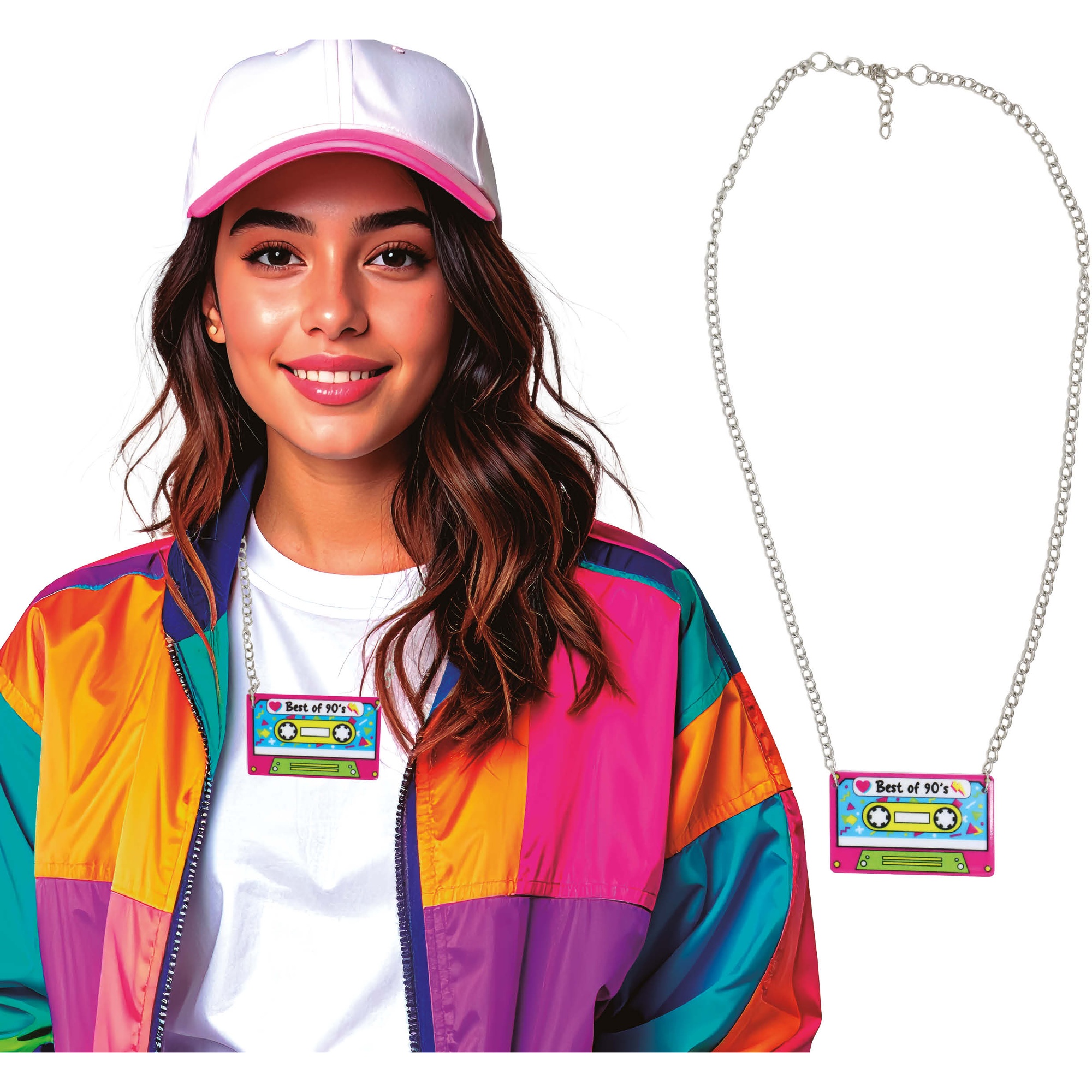 Colar cassete com estética retrô dos anos 90 que acrescenta um toque nostálgico e divertido a qualquer visual. O pingente colorido reproduz o clássico design da fita em tons vivos, com a inscrição "Best of 90's", ideal para o(a) senhor(a) que procura um acessório com personalidade.