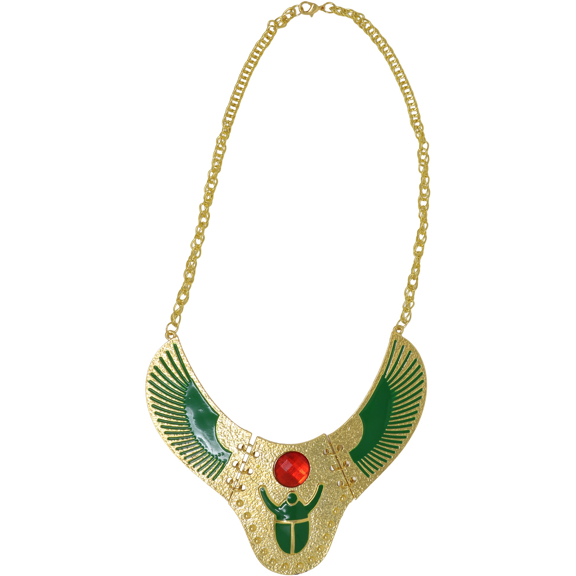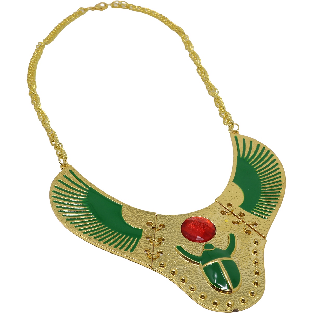 Colar de estilo egípcio inspirado na figura de Cleópatra. Apresenta um design com elementos alados, detalhes em verde e uma gema central vermelha que confere um ponto de cor e elegância. Ideal para completar o seu visual de rainha egípcia no Carnaval, em festas temáticas, no teatro ou em sessões fotográficas. Proporciona um impacto visual imediato e realça qualquer traje inspirado na antiguidade egípcia.