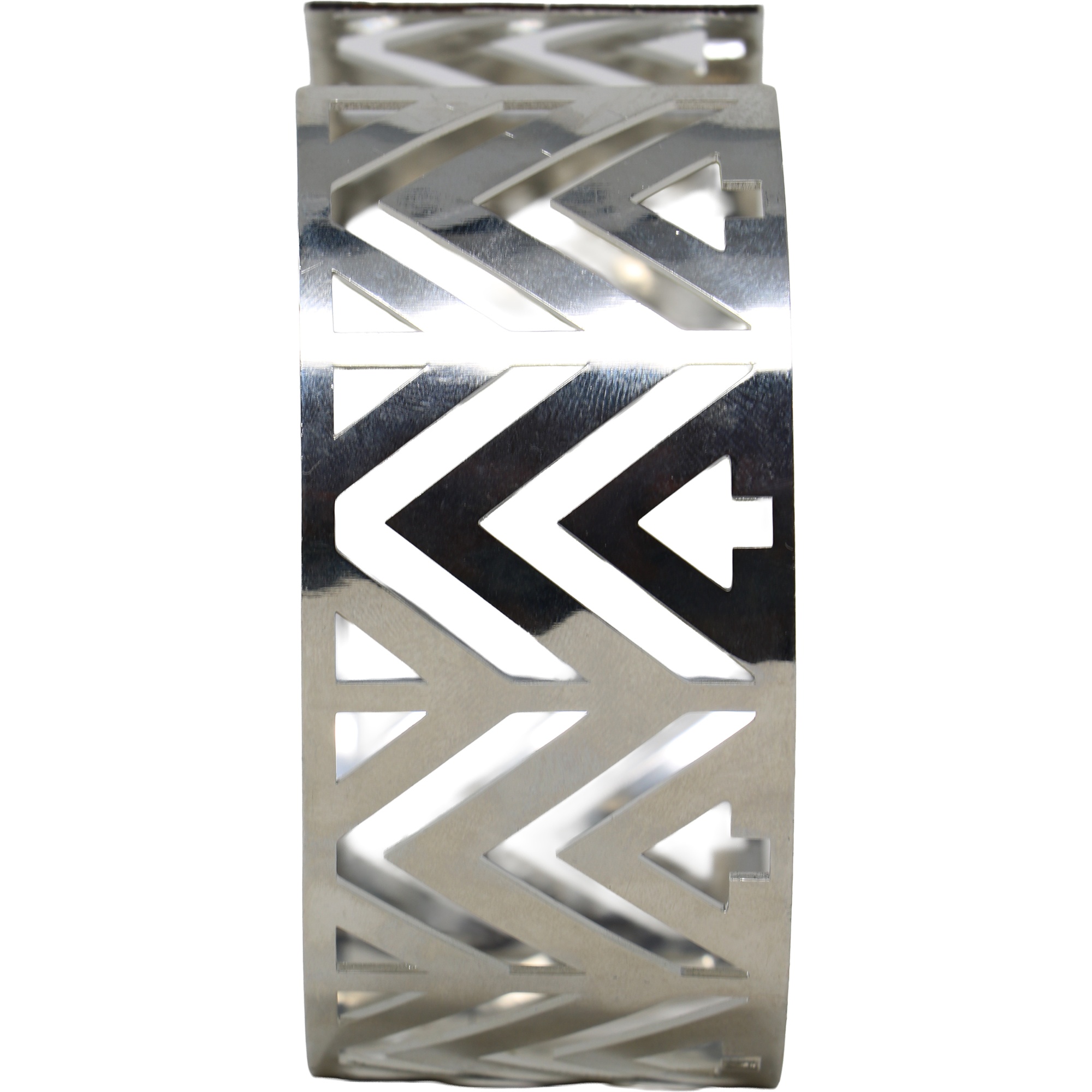 - Design rígido e geométrico com acabamento metálico refletivo para um visual futurista.