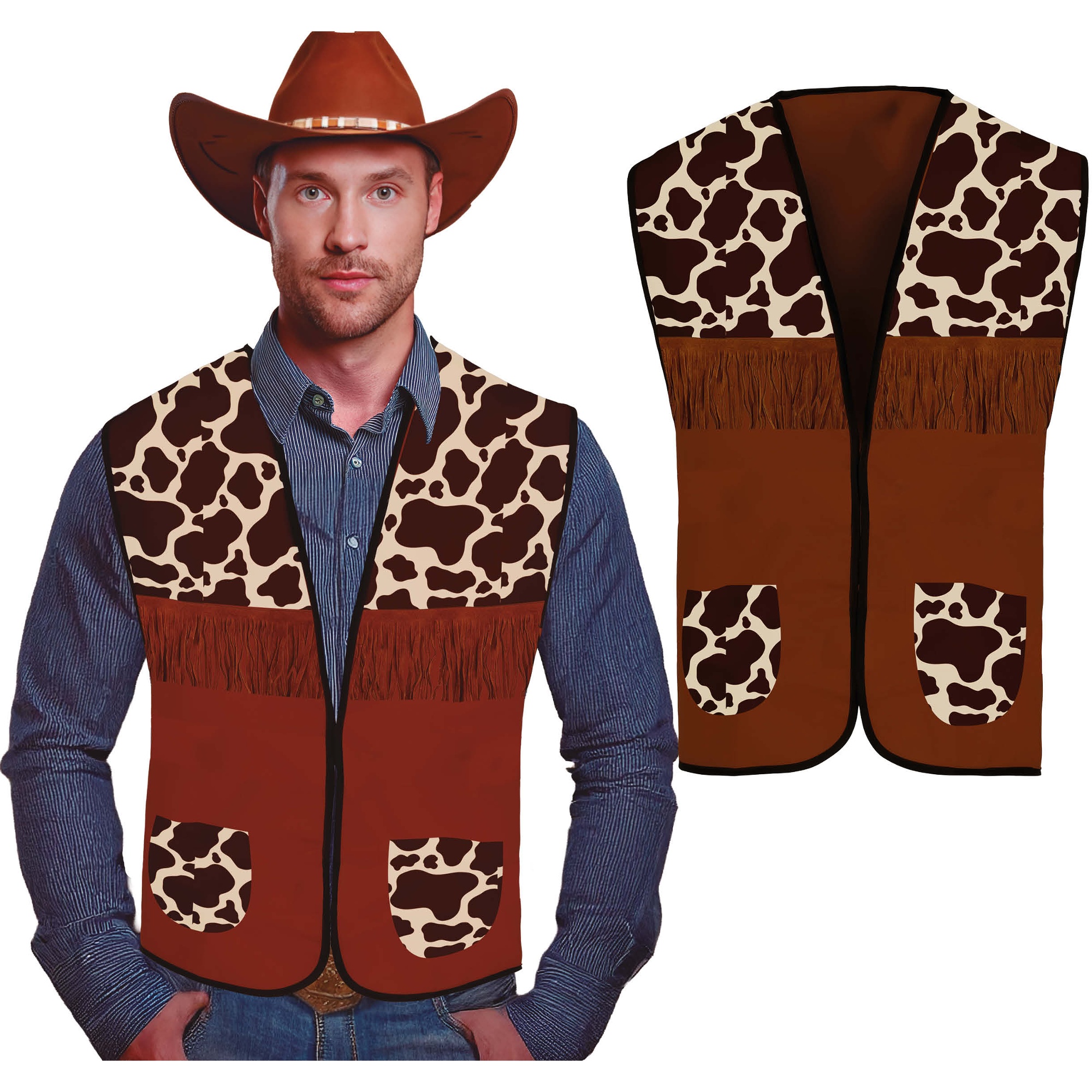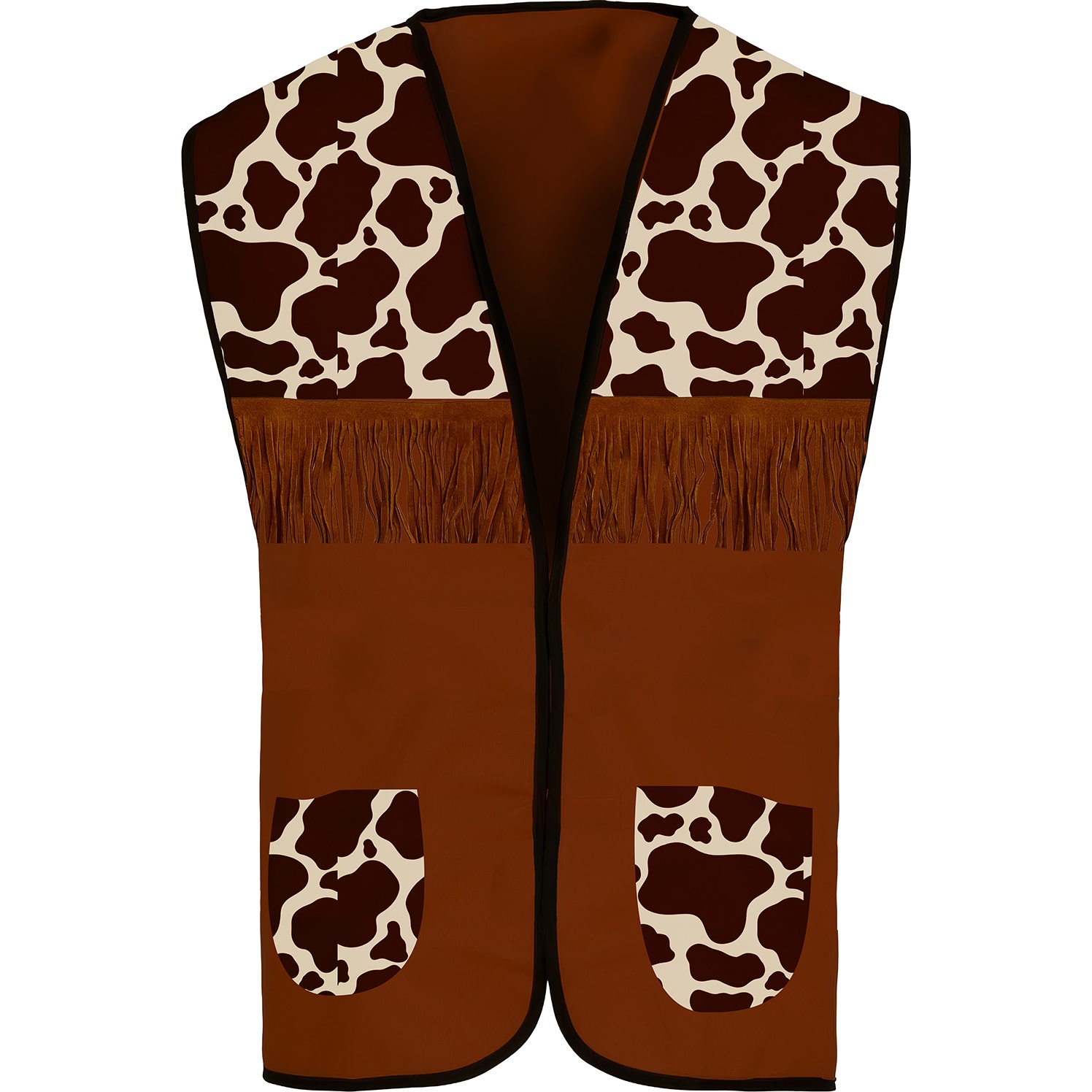 Colete vaqueiro estilo cowboy para adulto com detalhes que evocam o clássico visual do Oeste. Apresenta estampa tipo vaca nos ombros e bolsos, e uma faixa de franjas decorativas no peito que conferem personalidade ao conjunto. Confeccionado em poliéster leve para uso confortável como complemento de fantasia. Corte aberto e acabamento com ribete escuro que realça o contraste do padrão.