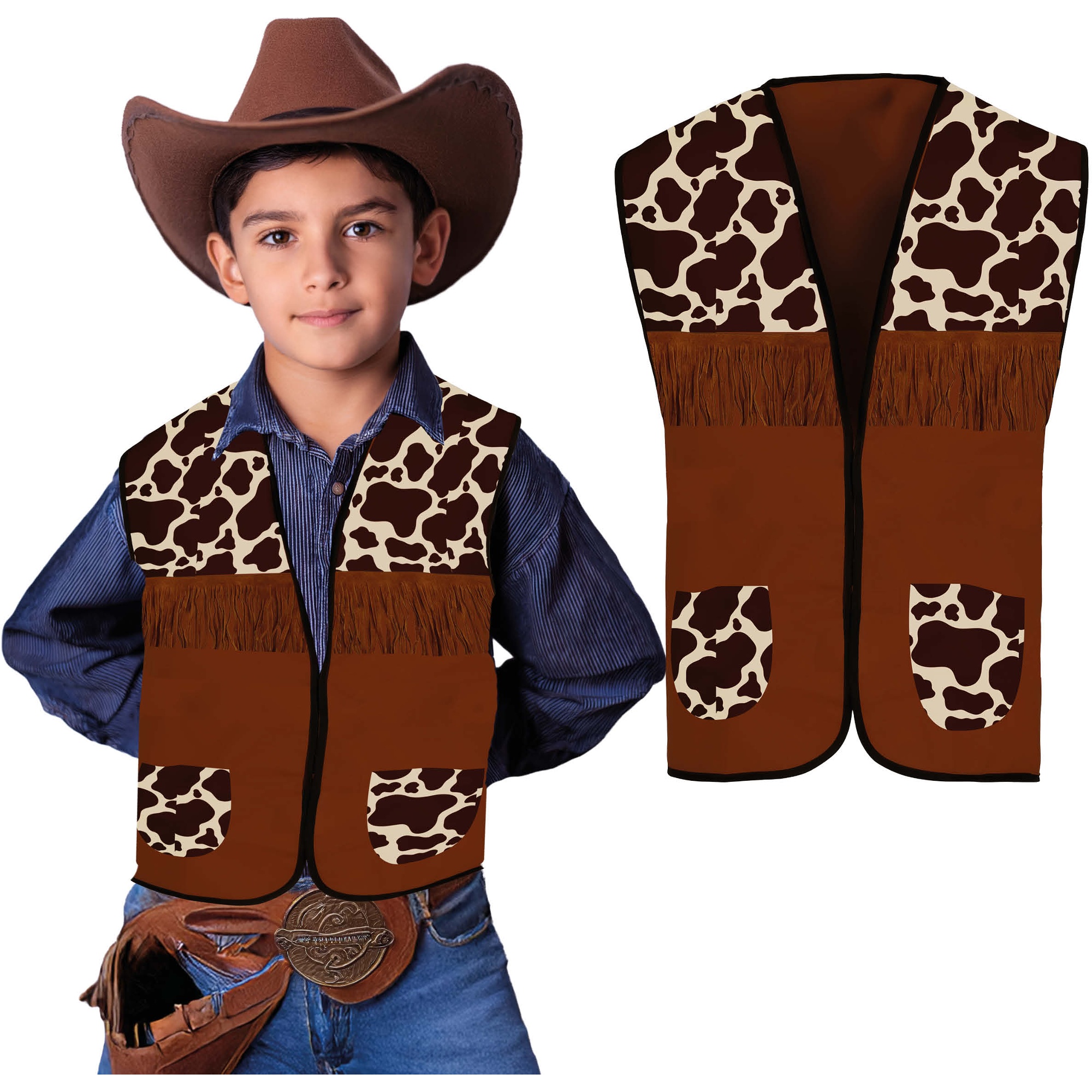 Colete infantil estilo cowboy com estampa de vaca e franjas decorativas, que confere um toque divertido e autêntico ao visual.