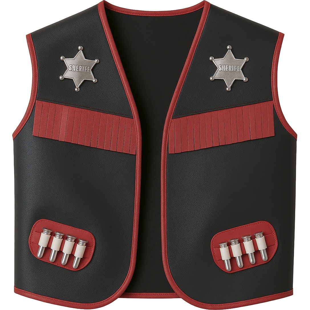 Colete infantil de caubói pensado como complemento para fantasias e brincadeiras de imitação. Apresenta acabamento em imitação de couro com franjas e viés contrastante que recriam o estilo do Velho Oeste. Inclui plaquinhas decorativas de xerife e pequenas cartucheiras que valorizam o visual caubói. Corte confortável e aberto, para que você o vista na criança com facilidade; ideal para Carnaval, festas temáticas e atividades escolares.