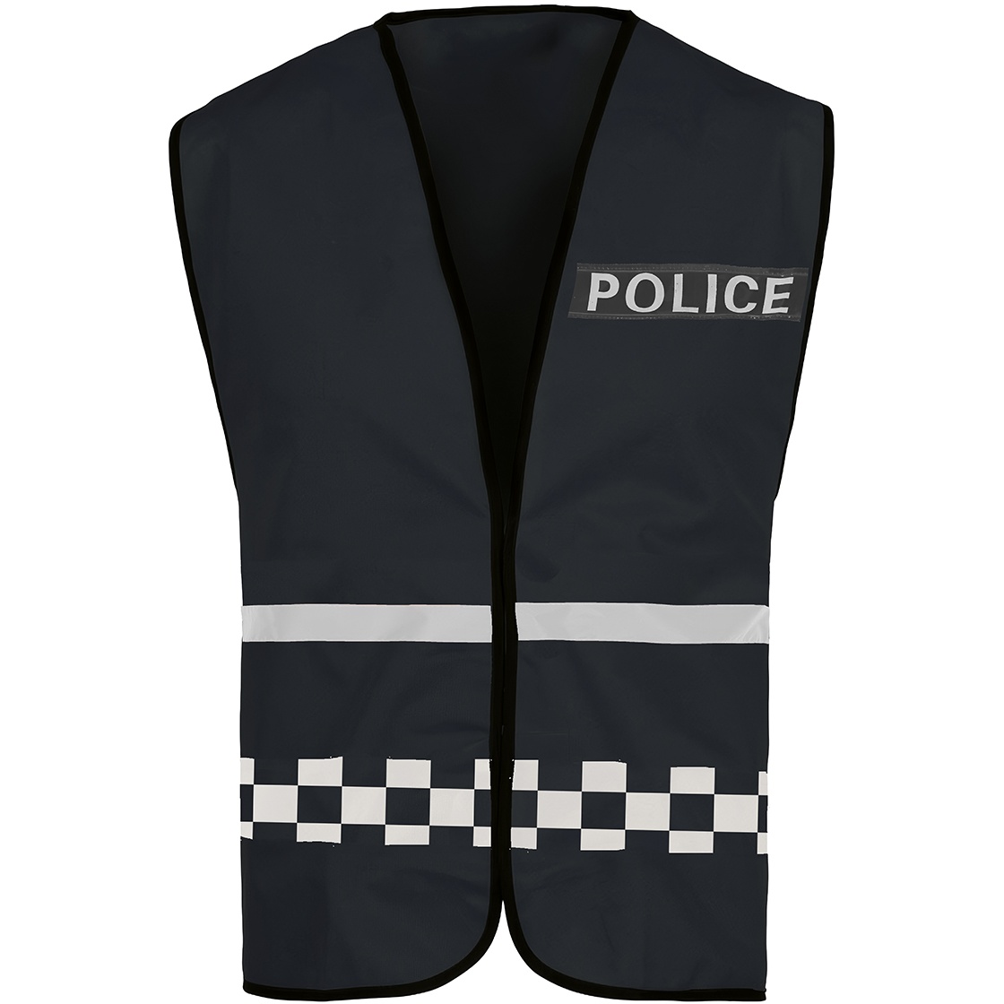 - Design realista com a inscrição 'POLICE' e faixas quadriculadas refletoras.
