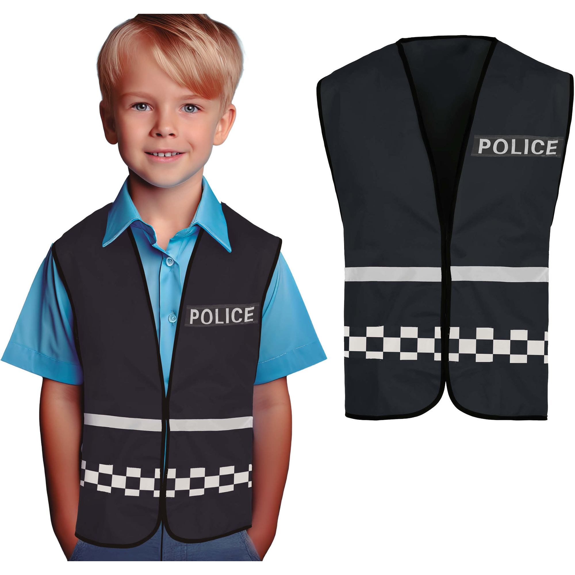 O colete de polícia preto foi pensado para fantasias e jogos de interpretação infantis. Apresenta um design realista com a inscrição "POLICE" e faixas quadriculadas refletoras que acrescentam estilo e visibilidade. Confeccionado em poliéster leve e resistente, oferece um corte confortável que permite total liberdade de movimentos durante a brincadeira. A abertura frontal facilita que o senhor/a senhora o vista e o retire rapidamente. Ideal para completar fardamentos de polícia e estimular o jogo imaginativo das crianças.