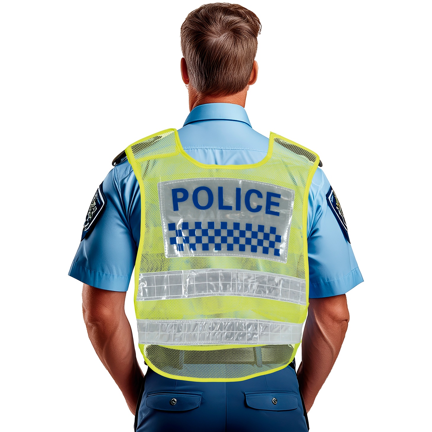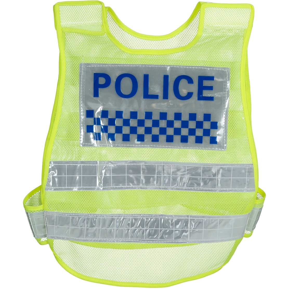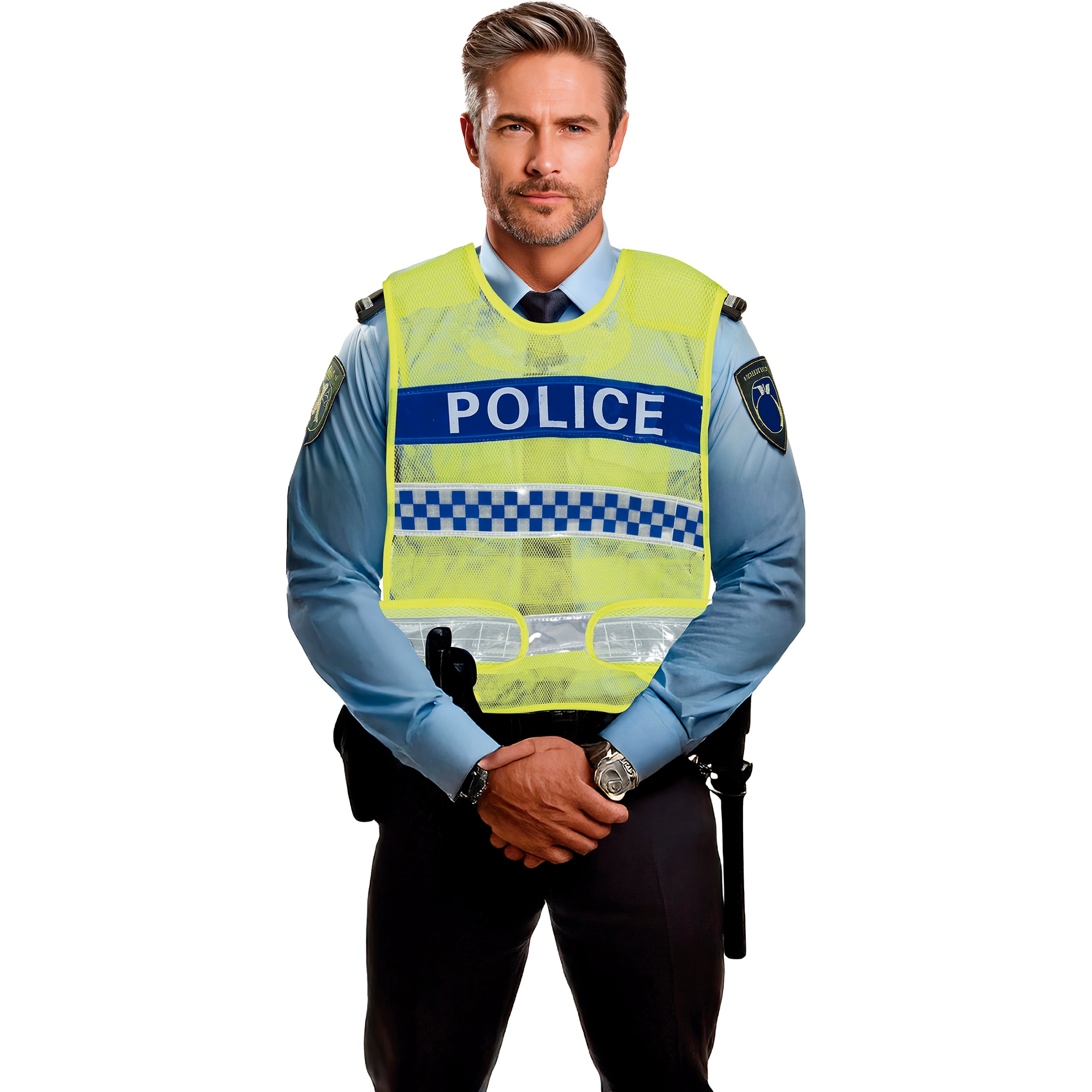 - Aparência realista com a inscrição "POLICE" e faixas xadrezadas que imitam coletes oficiais.