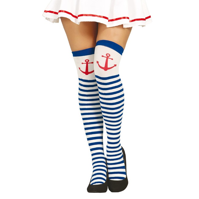 São meias finas com riscas horizontais brancas e azuis. Na parte superior, têm uma âncora vermelha que se destaca contra o fundo branco.