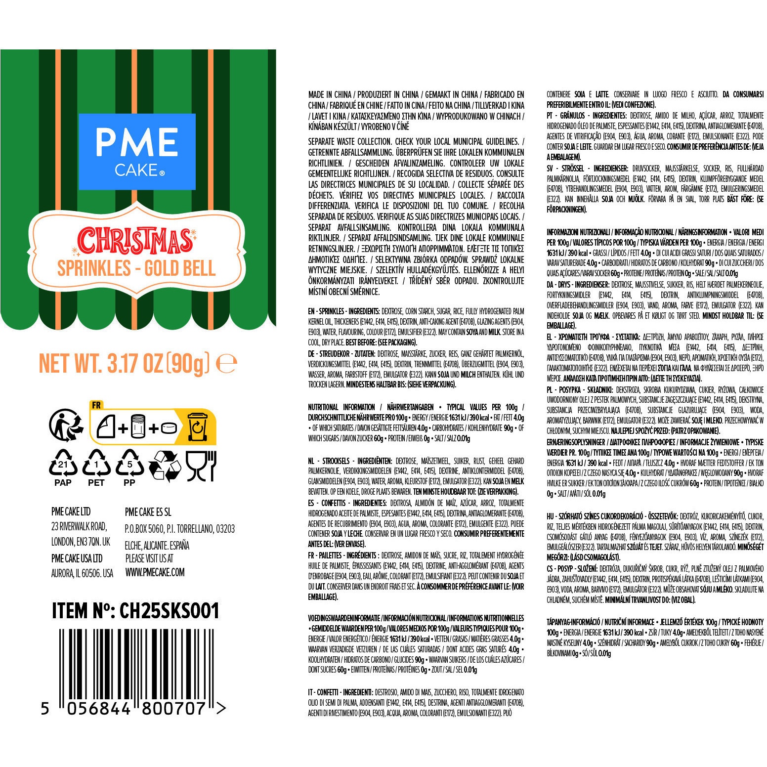 Ingredientes: dextrose, amido de milho, açúcar, óleo de palmiste totalmente hidrogenado, espessantes (E1442, E414, E415), dextrina, antiumectante (E470B), agentes de revestimento (E904, E903), água, aromatizante, corante (E172), emulsionante (E322).