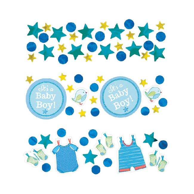 Tem também uma série de confettis maiores, sob a forma de recortes circulares de cartão em azul, com a inscrição is a baby boy em inglês e outros que simulam pequenas peças de roupa em diferentes cores.