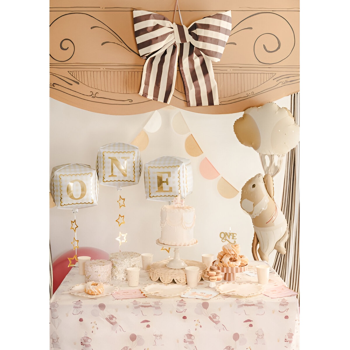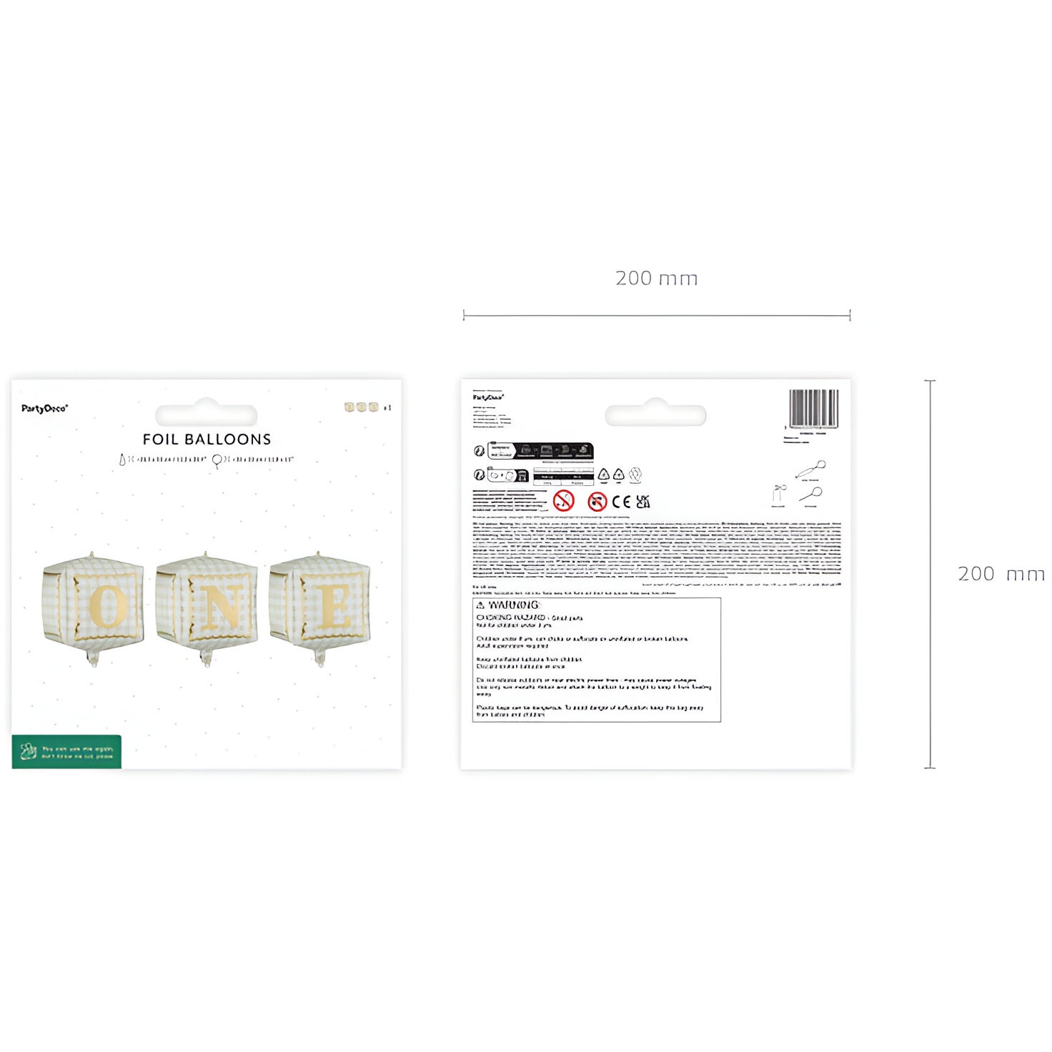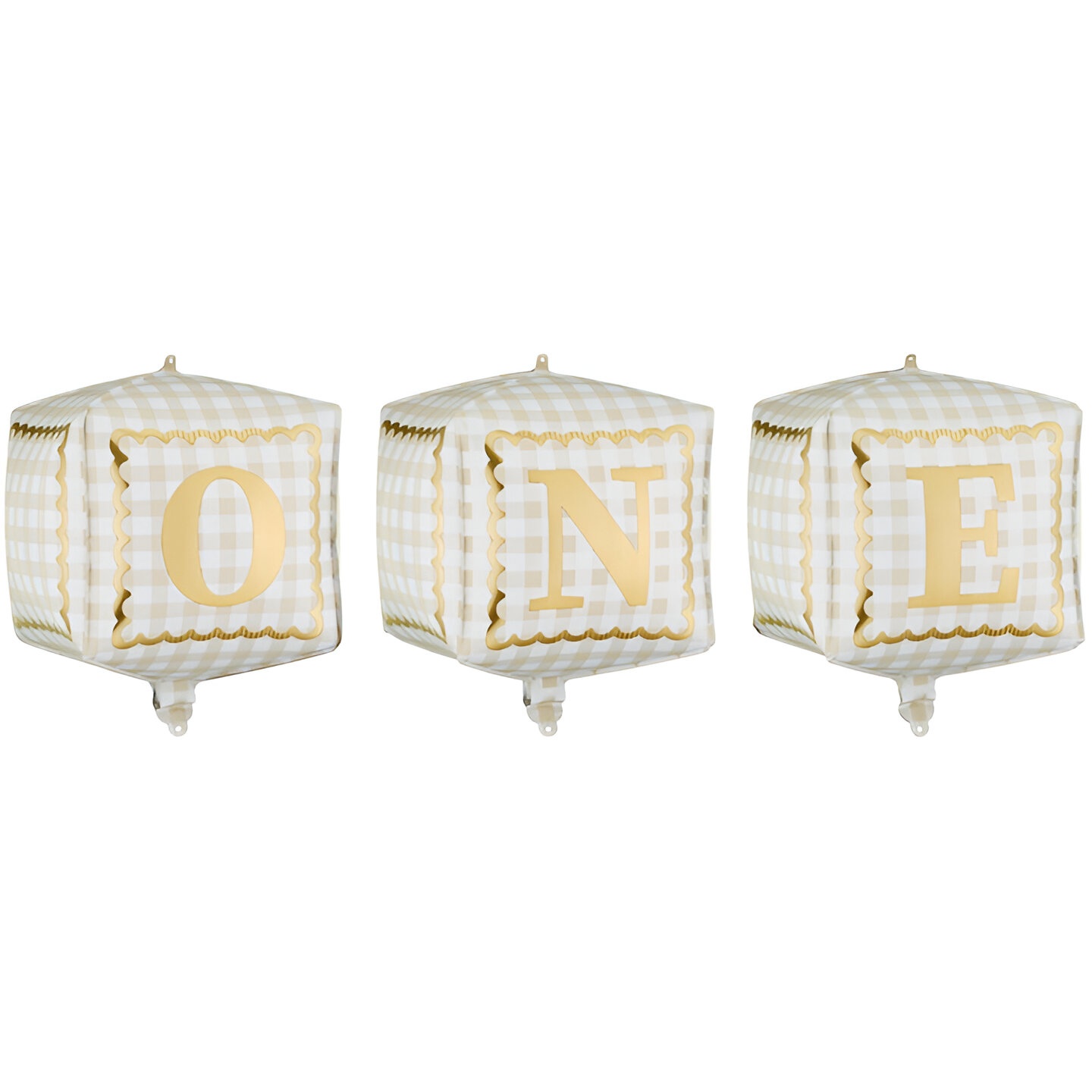 Conjunto elegante de balões em foil com design cúbico. Design em dourado e branco com as letras "ONE", que conferem um toque sofisticado e festivo. Medidas antes do enchimento: aprox. 28,5 x 53 cm; medidas aproximadas após o enchimento: 30 x 33 cm. Indicados para enchimento com ar ou hélio; mantêm o brilho e a forma graças ao material foil. Perfeito para que o senhor/a senhora crie um cenário decorativo marcante e elegante em celebrações infantis.