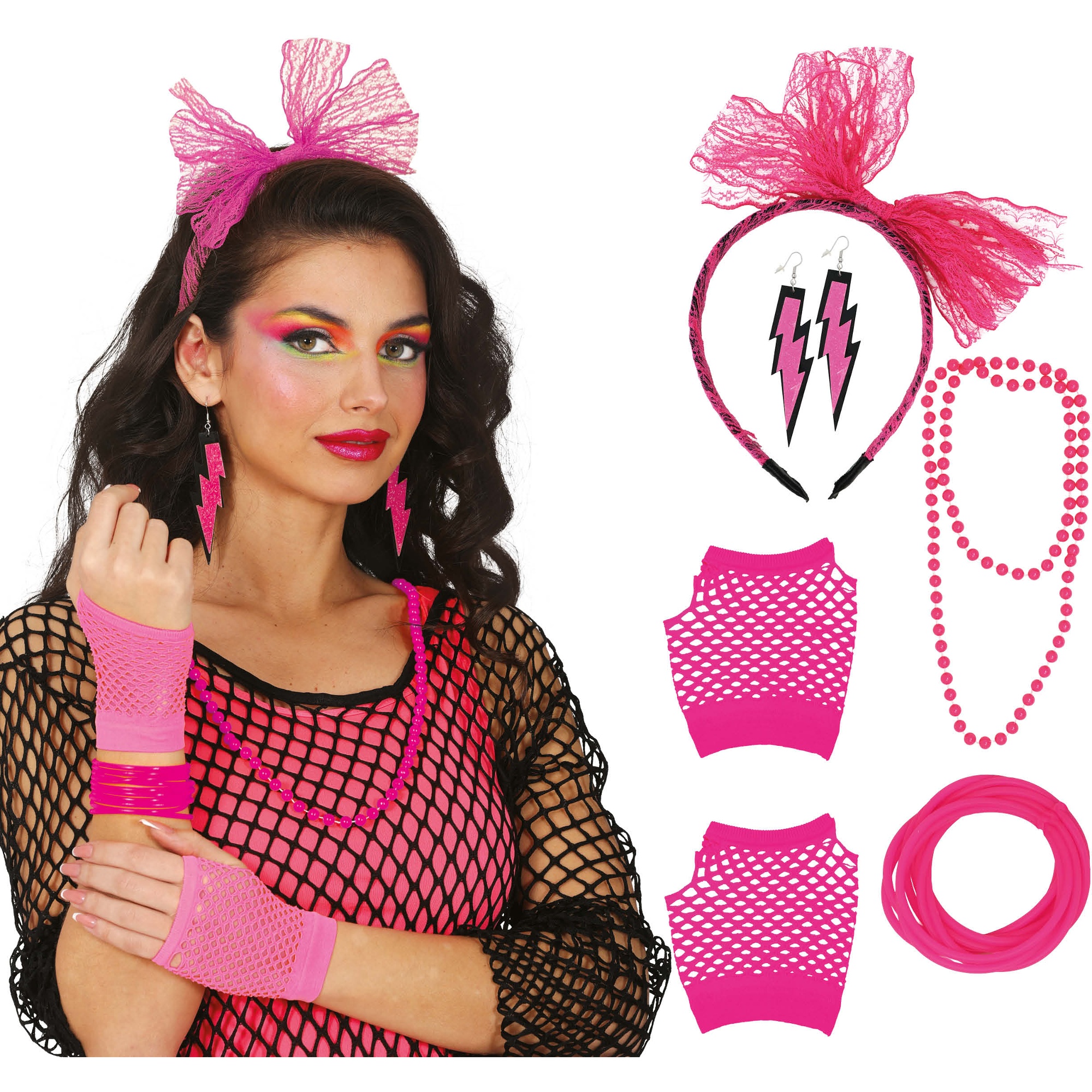 Conquiste a pista com um look retrô e cheio de cor graças a este conjunto de acessórios inspirado nos anos 80. Os tons néon e as formas chamativas conferem um estilo arrojado e imediatamente reconhecível. As peças são leves e confortáveis, pensadas para que o senhor/a senhora as use durante toda a noite sem abrir mão do impacto visual. Perfeito para que o senhor/a senhora combine com maquiagem oitentista e peças em rede ou cores intensas, alcançando um resultado muito autêntico.