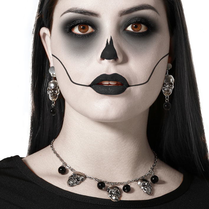 • Colar com pendente de caveiras prateadas e brincos a condizer. Perfeito para estilos góticos, bruxas ou morte elegante.