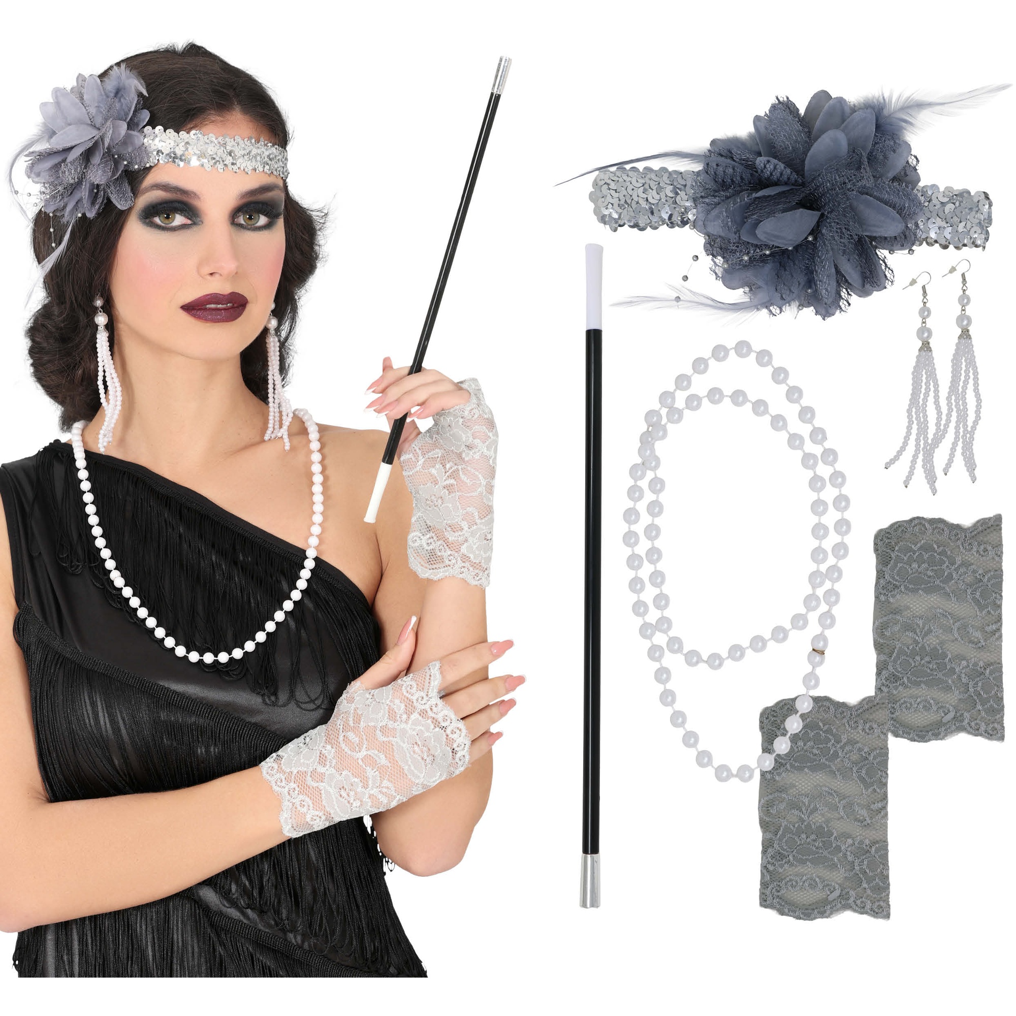 Conquiste um visual Charleston autêntico com este elegante conjunto de acessórios inspirado nos anos 20. Projetado para conferir um toque de glamour vintage, combina brilho, renda e plumas para um acabamento sofisticado. Peças leves e confortáveis que valorizam qualquer traje de época, acrescentando movimento e estilo. Perfeito para completar um look retrô em eventos temáticos, sessões de fotos ou celebrações especiais. Materiais sintéticos que preservam o brilho e a forma.