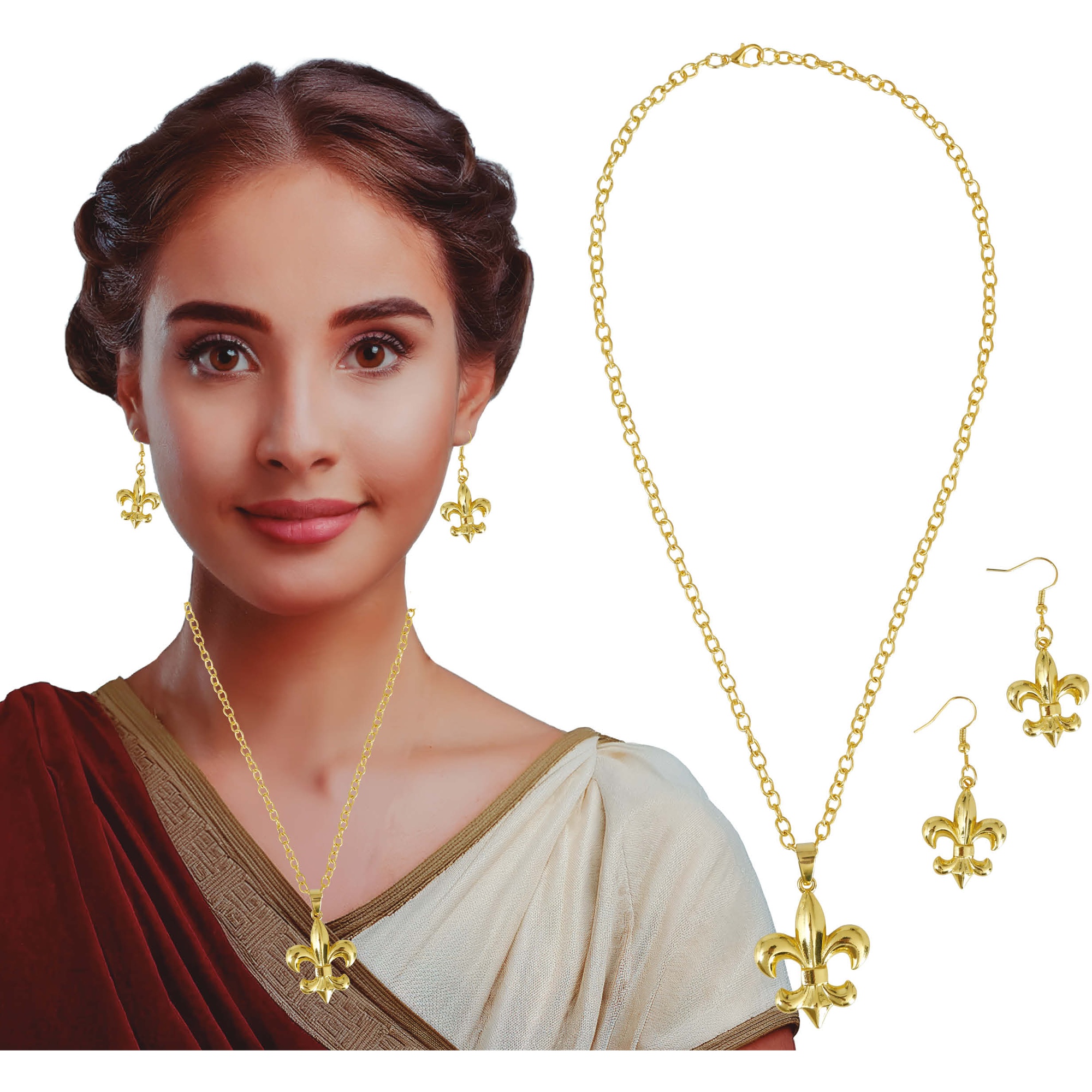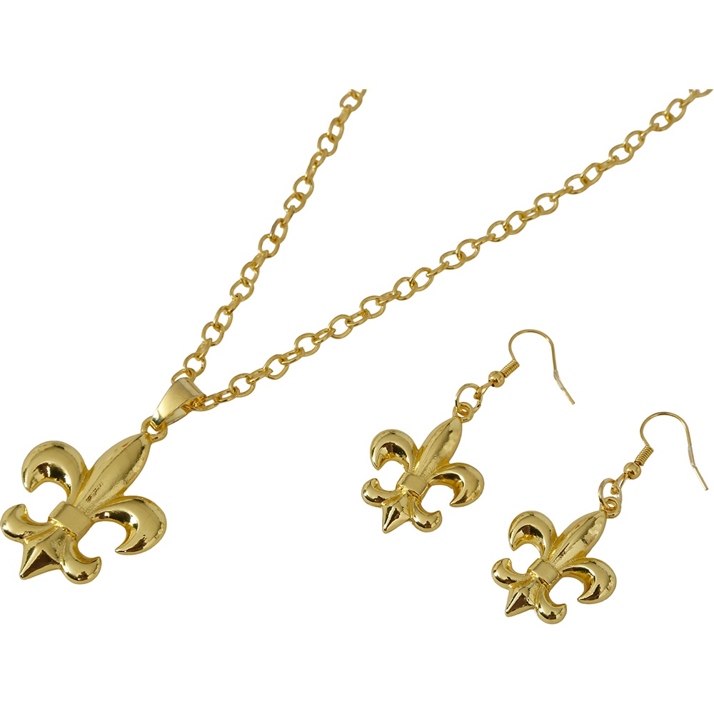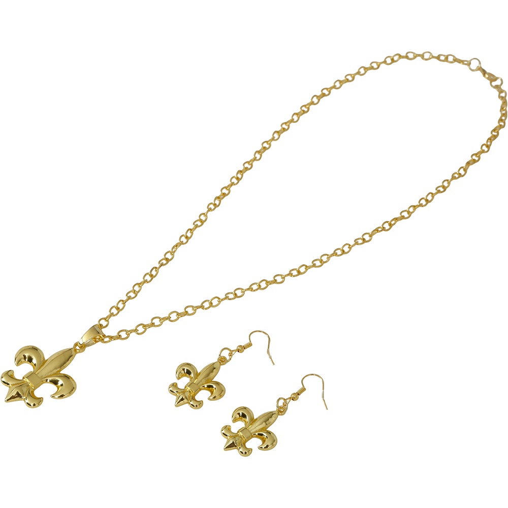 Conjunto elegante inspirado na joalheria da Roma clássica, com o distintivo motivo em forma de flor-de-lis. O acabamento dourado proporciona um brilho refinado que valoriza qualquer visual de época ou fantasia. Peças leves e confortáveis, desenhadas para acrescentar um toque imperial em celebrações e eventos.