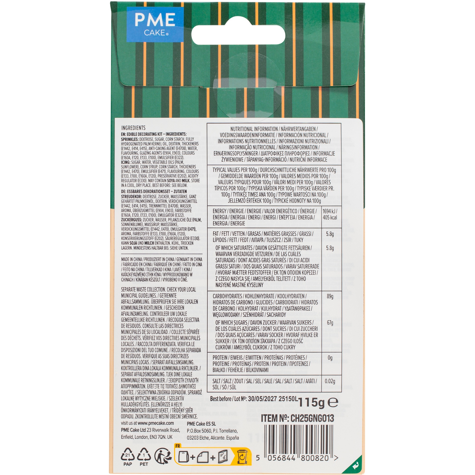 Ingredientes do glacê: açúcar, água, óleos vegetais (palma, girassol), xarope de milho, amido de milho, espessantes (E1442, E470), emulsificante (E471), aroma, corantes (E133, E100, E160A, E120), conservante (E202), regulador de acidez (E330).