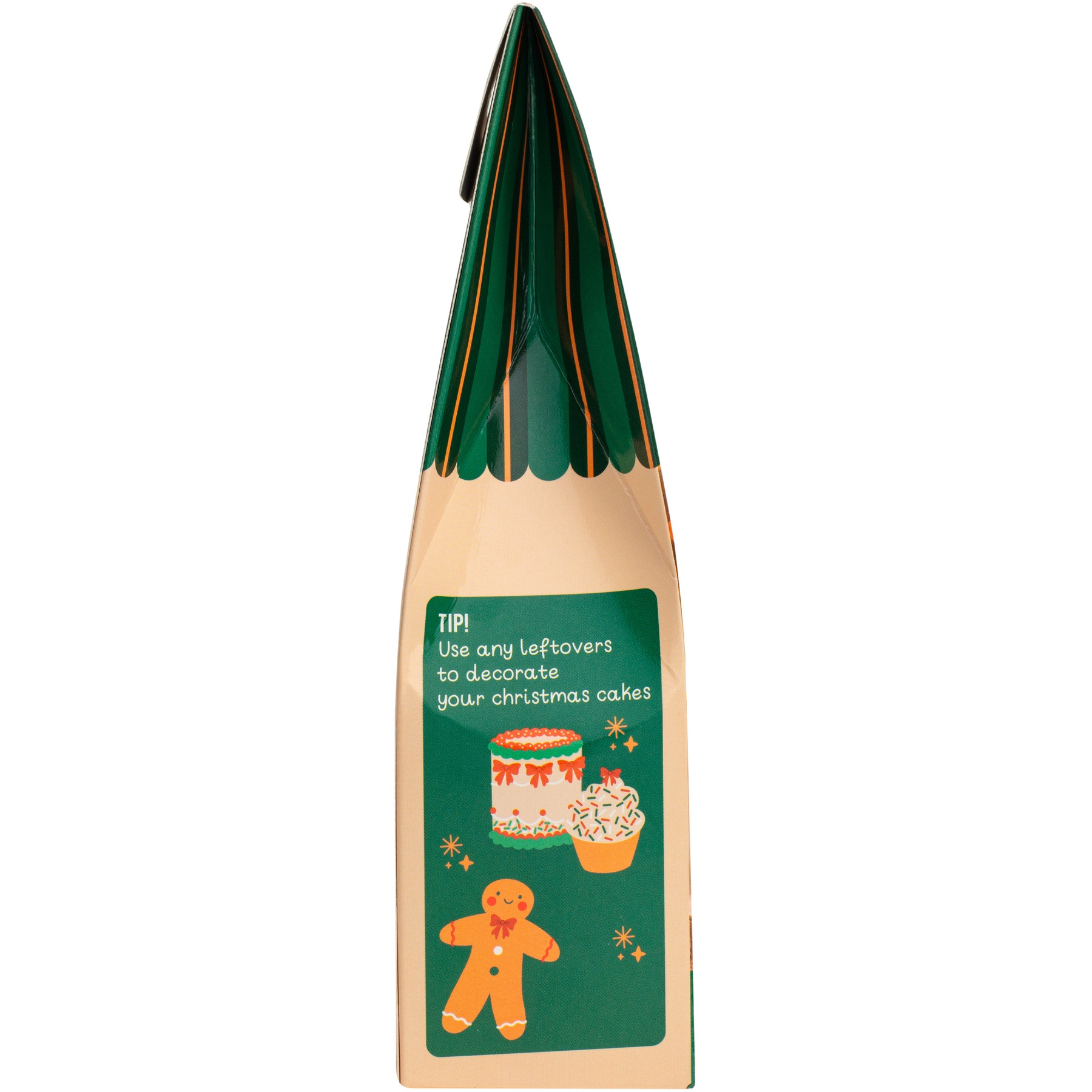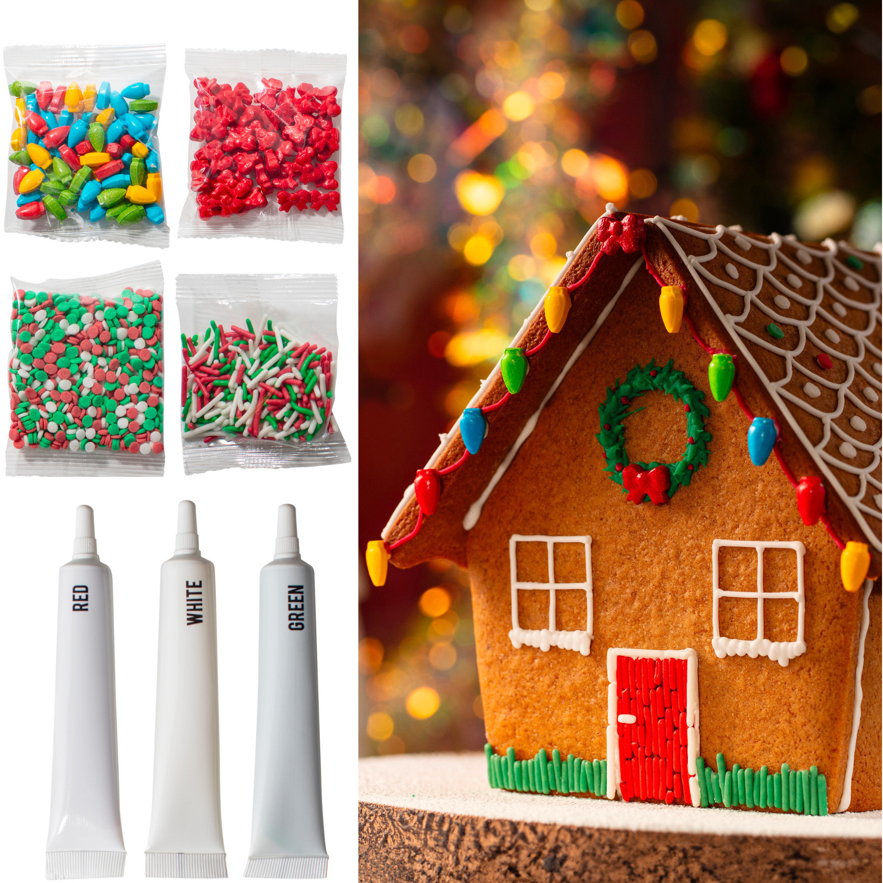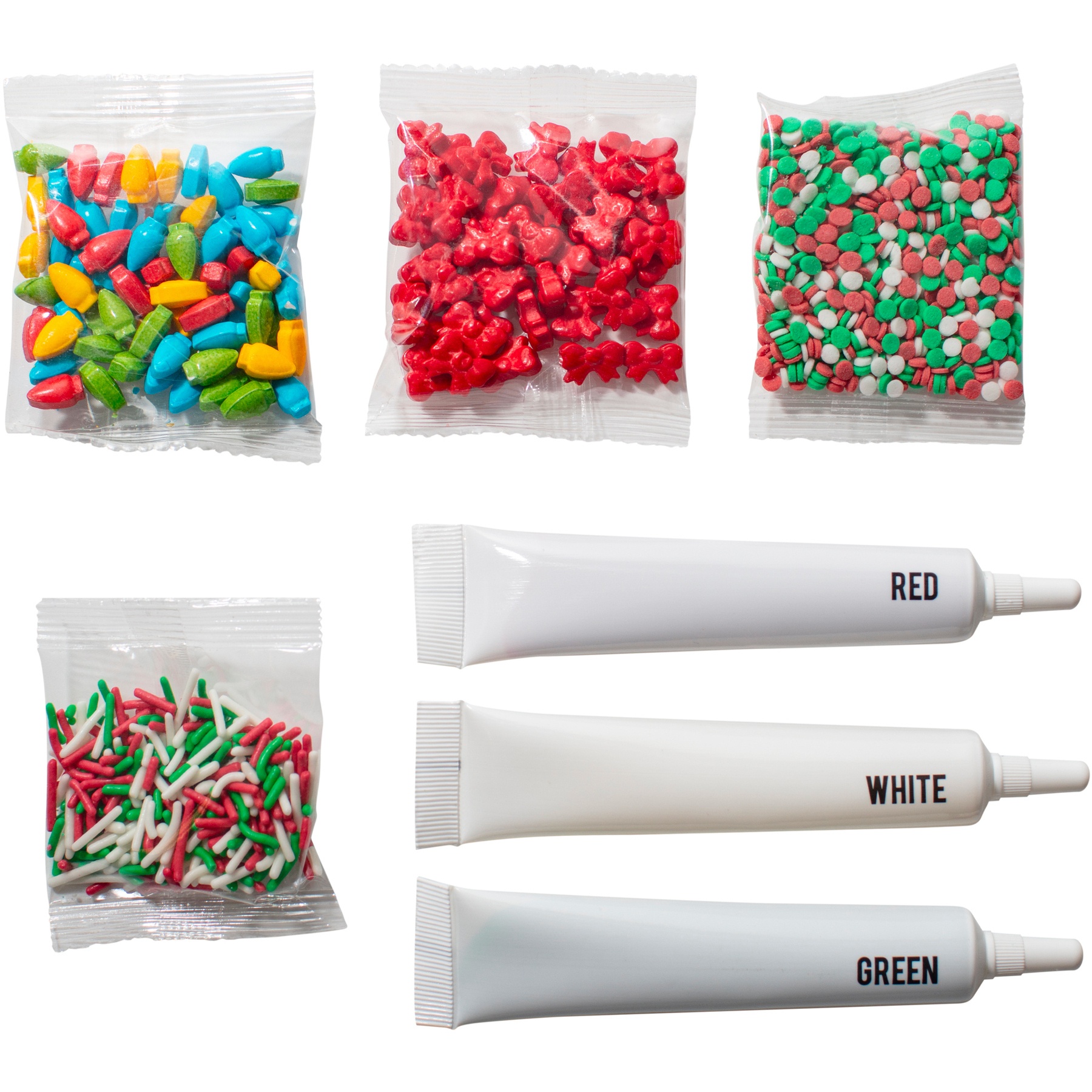 - Inclui: 3 tubos de glacê colorido (branco, verde e vermelho) e 4 pacotes de confeitos (laços vermelhos, luzes de Natal, granulados e confetes brancos, verdes e vermelhos).