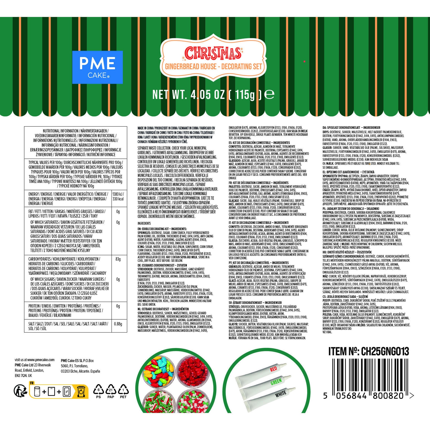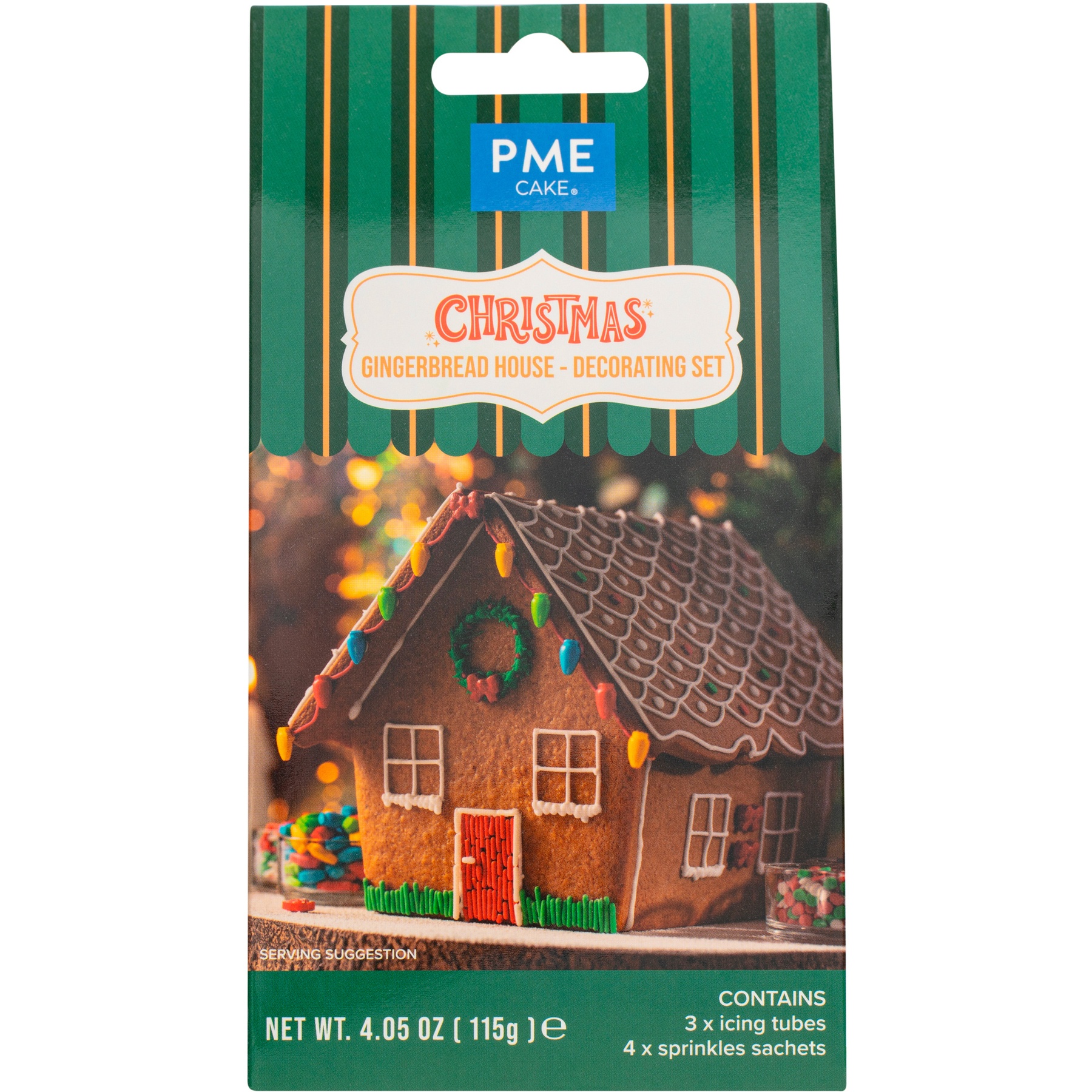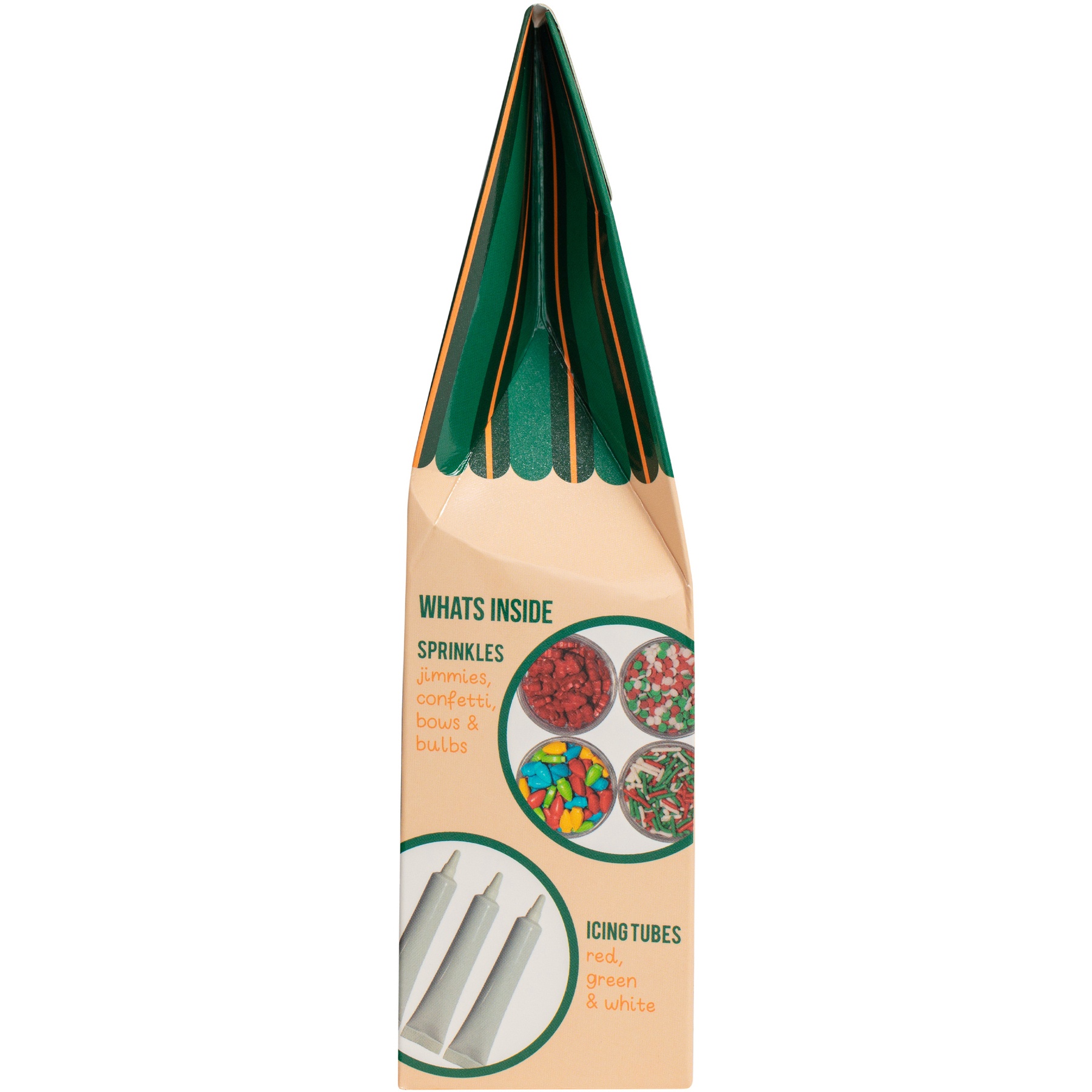 - Inclui: 3 tubos de glacê colorido (branco, verde e vermelho) e 4 pacotes de confeitos (laços vermelhos, luzes de Natal, granulados e confetes brancos, verdes e vermelhos).
