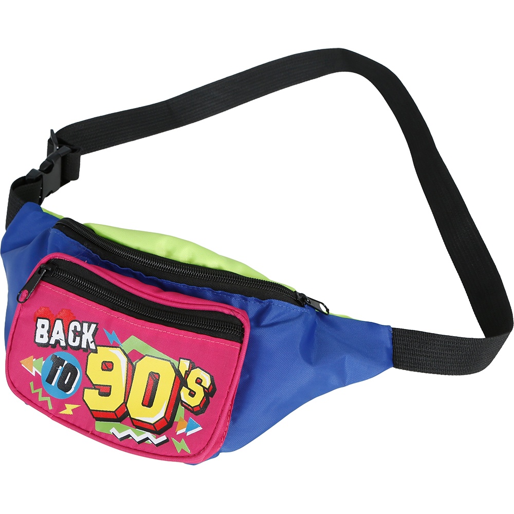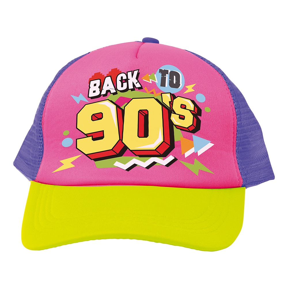 - Boné e pochete com estética retrô 'Back to 90's' em cores néon que chamam atenção na pista de dança.