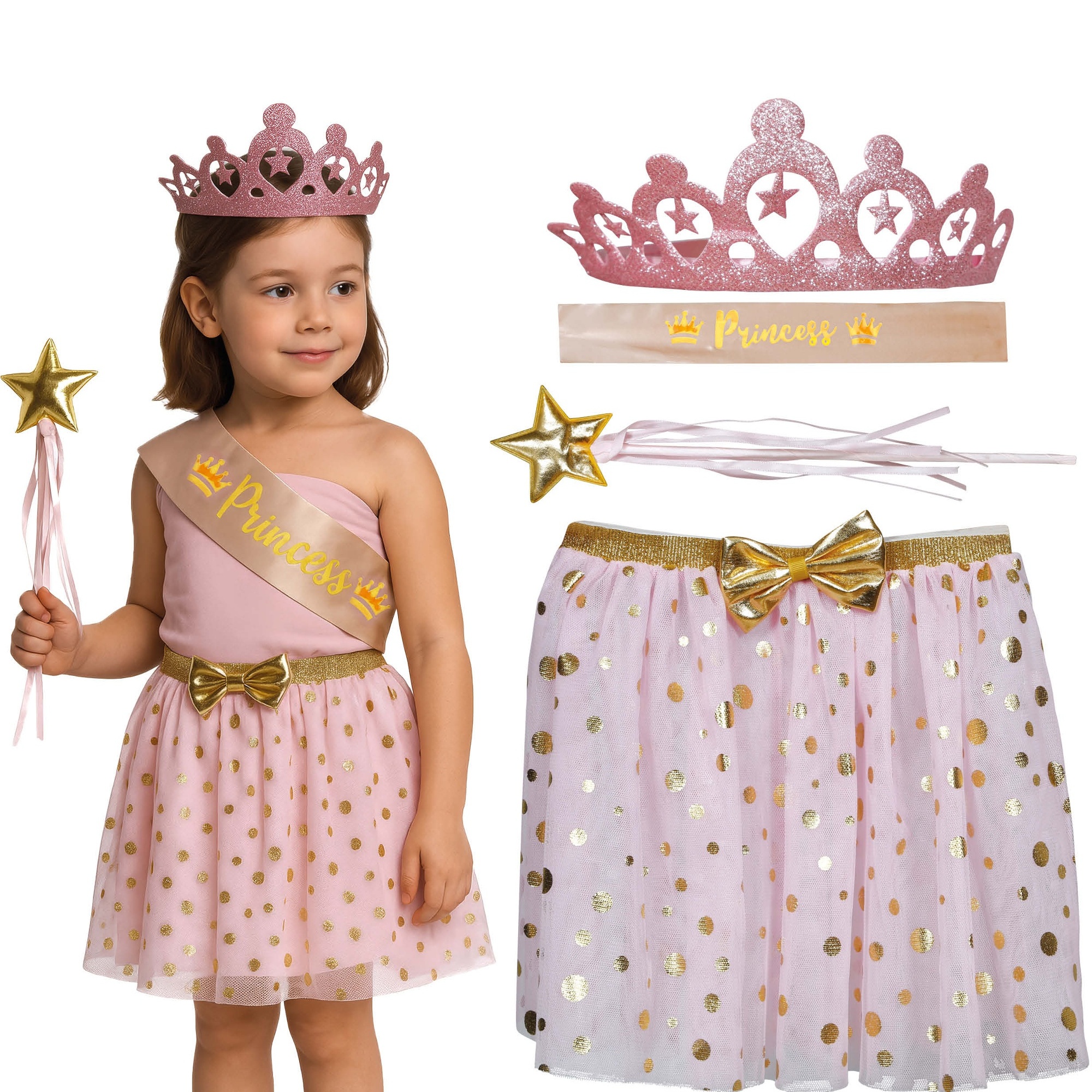 Conjunto de princesa infantil pensado para celebrações e brincadeiras de fantasia. Design em tule com detalhes dourados que confere um acabamento brilhante e muito fotogênico. Peças leves e confortáveis para que as meninas possam brincar e dançar durante horas. Materiais resistentes (poliéster e PVC); recomenda-se lavagem delicada à mão para preservar o brilho.