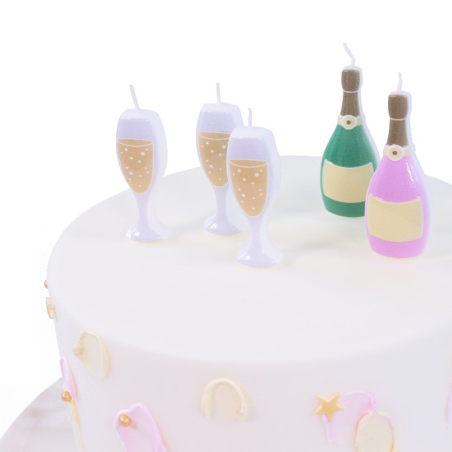 As velas perfeitas para acompanhar e completar qualquer celebração. Composta por 3 velas em forma de taças de champanhe acompanhadas por duas velas em forma de garrafas.