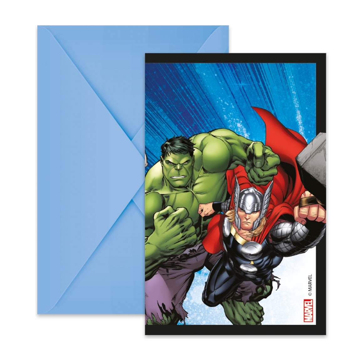 Convites temáticos dos Vingadores com ilustrações dinâmicas do Hulk e do Thor que capturam a atenção dos mais pequenos.