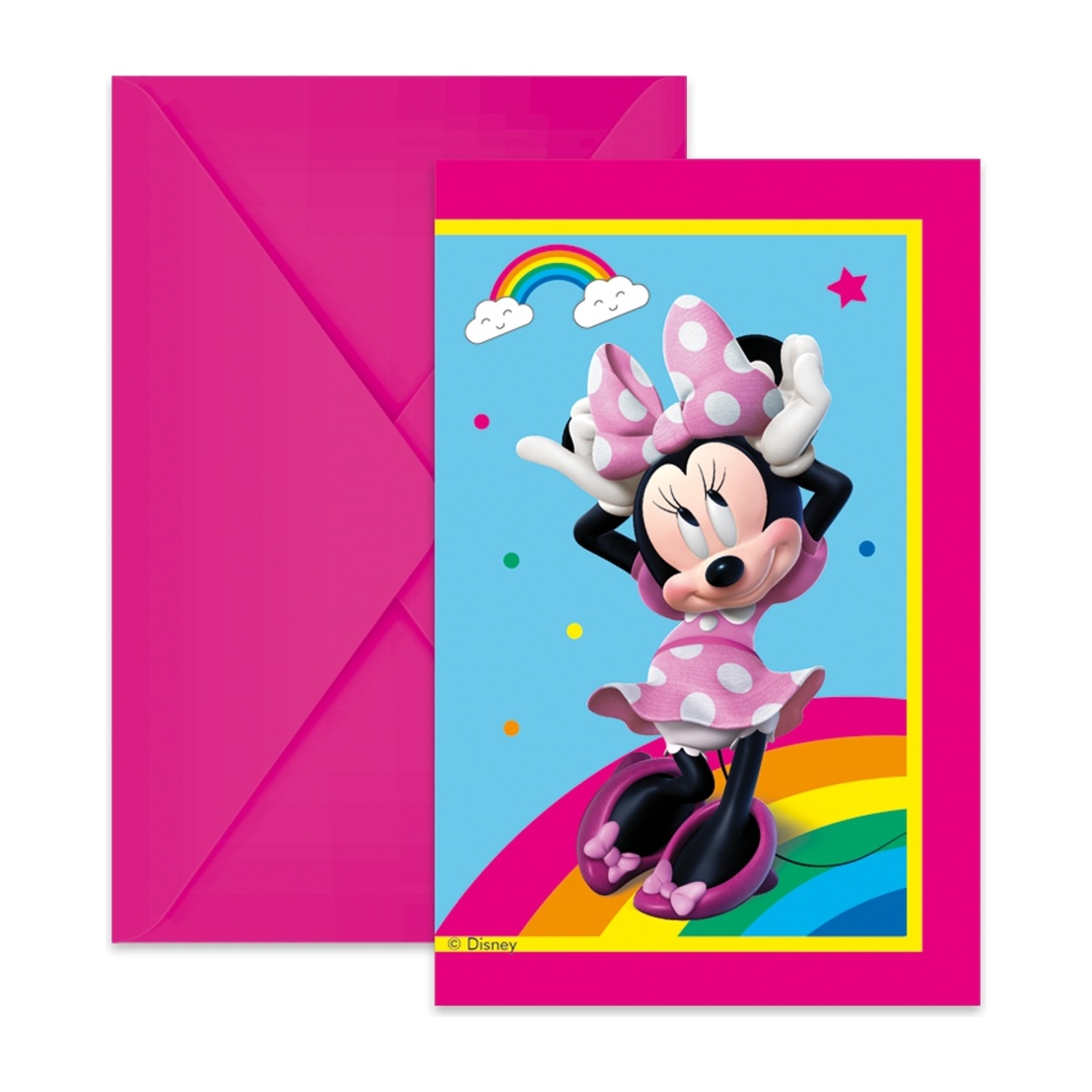 Convites infantis com o encantador design da Minnie Mouse e um motivo arco-íris colorido, ideais para aniversários de meninas.