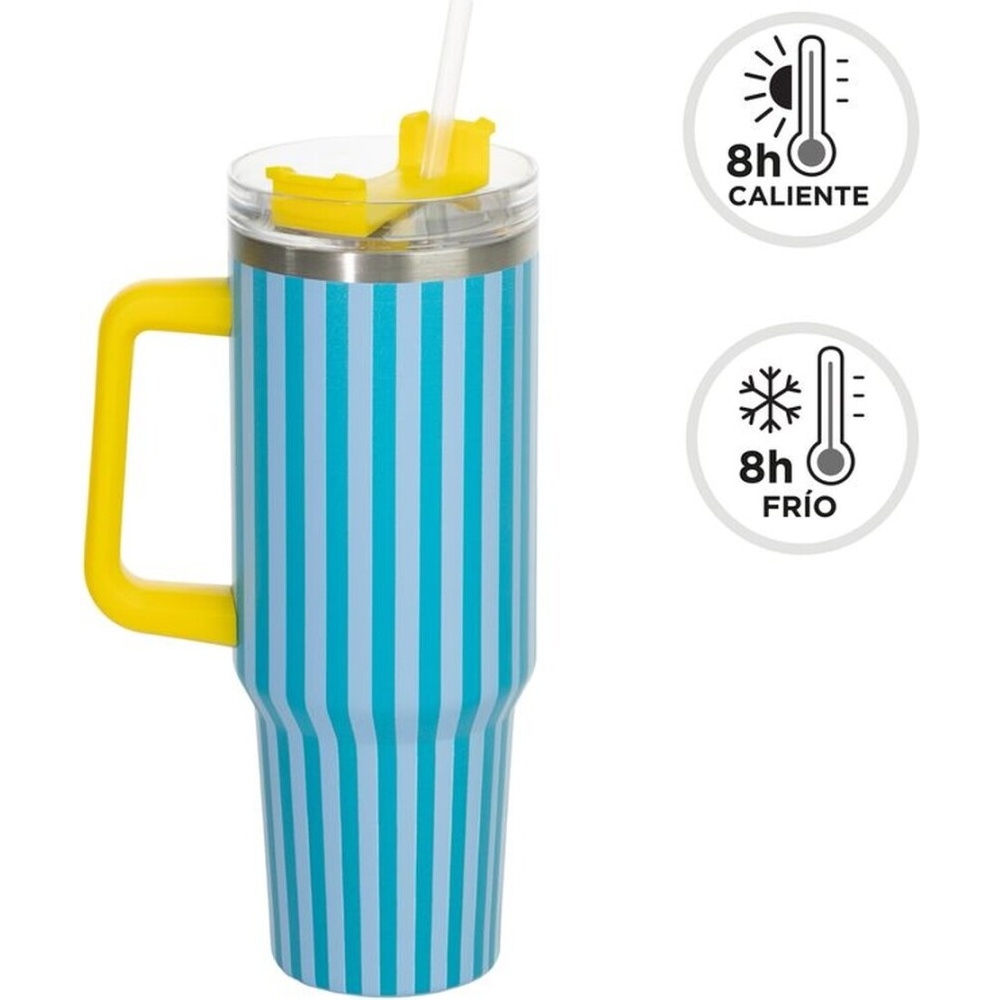 Desfrute das suas bebidas favoritas por horas com este copo térmico de grande capacidade e um alegre design listrado. A sua construção de dupla camada mantém as bebidas frias ou quentes por até 8 horas, oferecendo comodidade e desempenho em qualquer ocasião. A tampa com fechamento e o canudo integrado permitem beber com facilidade e reduzem respingos, enquanto a alça ergonômica facilita o transporte. Um acessório prático e com estilo para os seus passeios, o escritório ou o tempo de lazer.