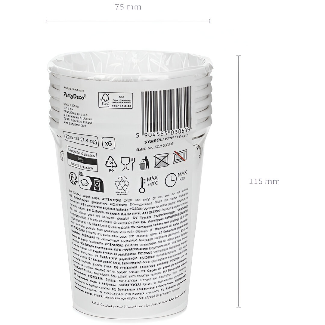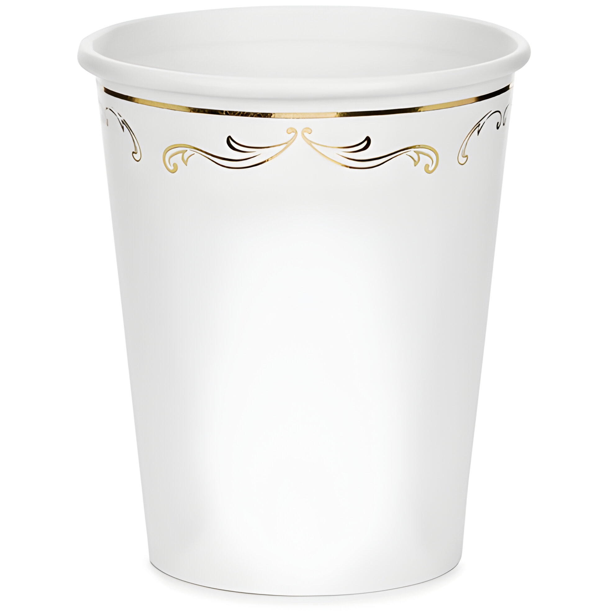 Copos de papel brancos com um delicado adorno dourado que confere um toque sofisticado a qualquer celebração. Altura aprox. 9 cm e capacidade aprox. 220 ml (7,4 oz). Produto de uso único, pensado para bebidas frias.