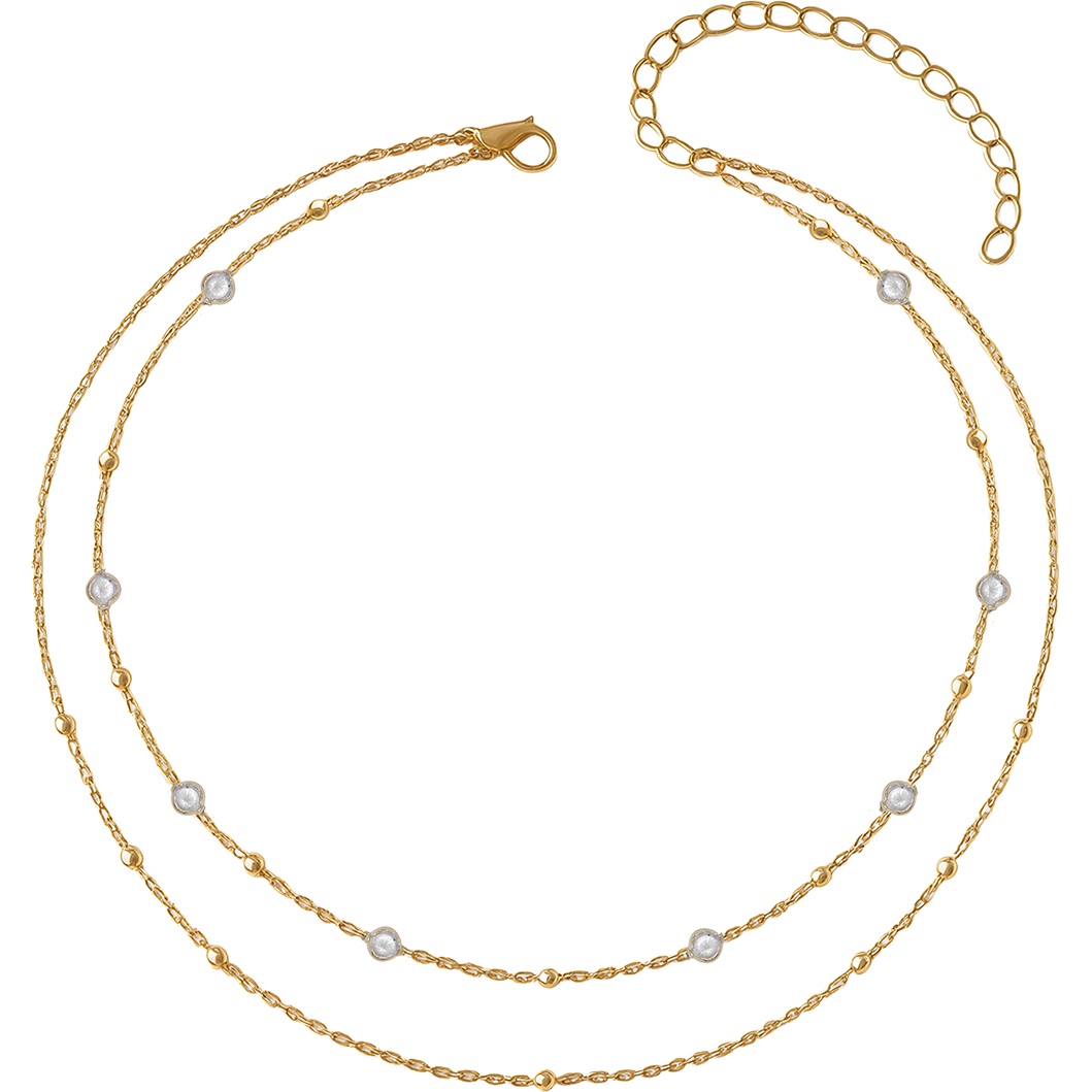 Corrente de cintura de duas voltas com delicados detalhes em pedras de acabamento prateado que conferem um brilho sutil.