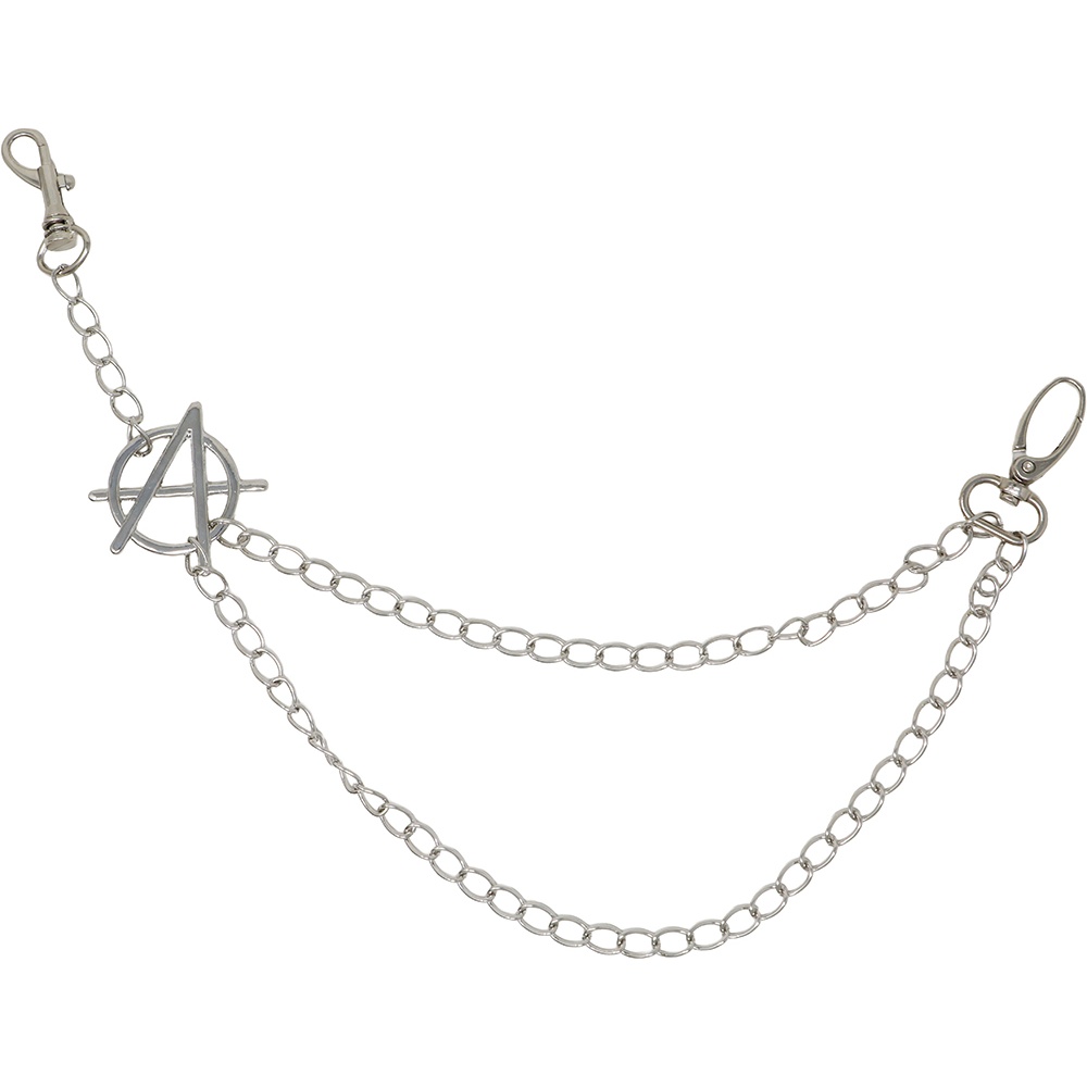 Este acessório de inspiração punk foi concebido para acrescentar um toque rebelde aos seus looks com jeans. O pendente com o símbolo da anarquia e a composição de duas correntes criam um efeito marcante e autêntico. Perfeito para concertos, saídas noturnas ou para completar um visual urbano cheio de atitude. Design pensado para ser facilmente fixado ao cinto ou às passantes do cós.